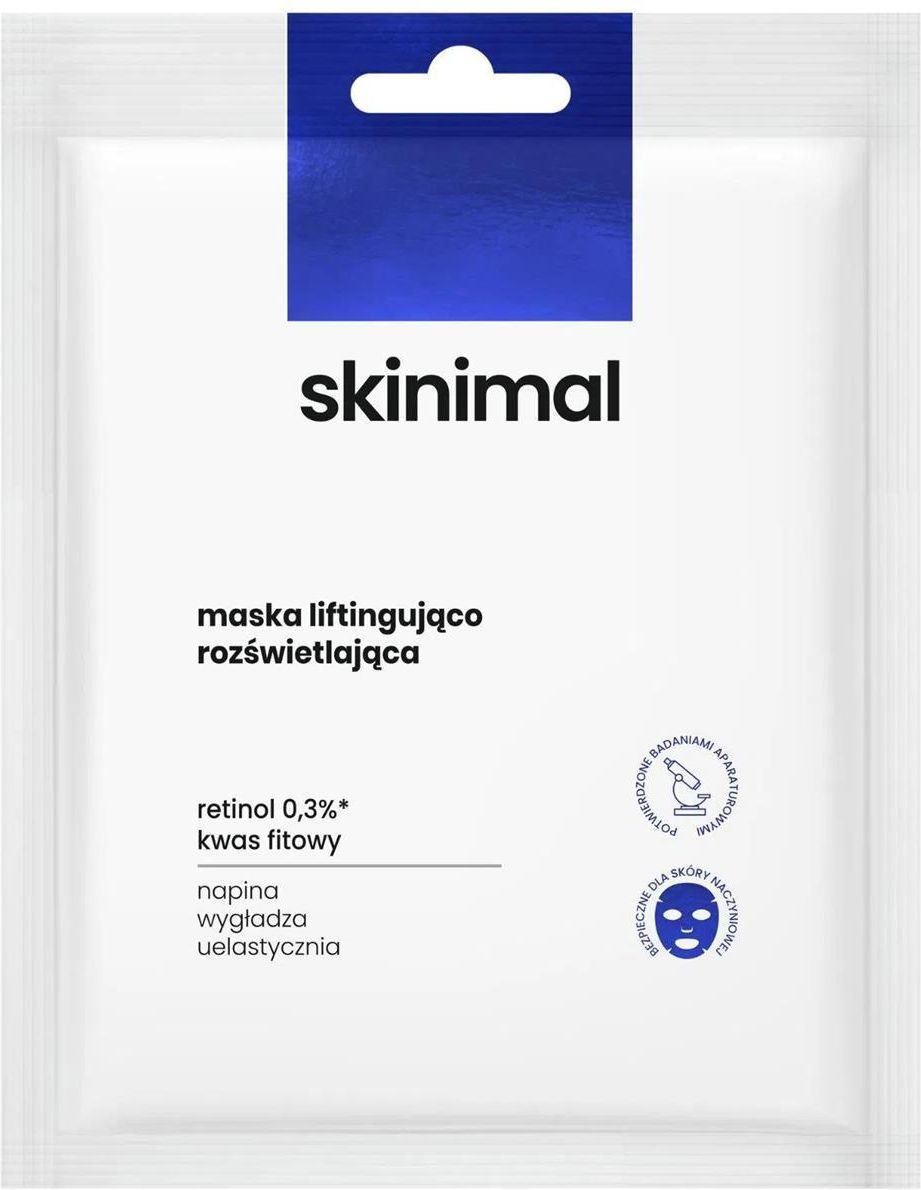 Skinimal maska liftingująco-rozświetlająca z retinolem i kwasem fitowym – napina, wygładza, uelastyczniaMaska liftingująco-rozświetlająca Skinimal to dermokosmetyk, którego formuła zawiera retinol i kwas fitowy, widocznie zmniejsza i redukuje niewielkie zmarszczki, pozostawia uczucie zregenerowanej skóry.Wysoka zawartość retinolu rozświetla i daje widoczny efekt odnowionej skóry. Kwas fitowy ujędrnia, skóra wygląda lepiej i zdrowiej.Maska stosowana regularnie pozwala uzyskać spektakularne efekty. Może być używana ze wszystkimi kosmetykami Skinimal.Retinol – eliminuje wiotkość skóry, widocznie zmniejsza linie zmarszczek.Kwas fitowy – przeciwutleniacz, nadaje skórze gładkości i elastyczności, widocznie rozjaśnia przebarwienia.Zalecane do pielęgnacji cery:Dojrzałej – z widocznymi oznakami starzenia.Mieszanej – poszarzałej bez blasku.15 ml = 1 sztuka.Sposób użycia maskiOtwórz saszetkę z maską, rozłóż tkaninę i połóż na skórę twarzy. Sugerowany czas aplikacji maski to 15 minut. Ściągnij tkaninę, a pozostałości wmasuj w skórę. Zalecana powtarzalność zabiegu 2 razy w tygodniu przez 4 tygodnie.**Tylko do użytku zewnętrznego, nie stosować na podrażnioną i uszkodzoną skórę. Unikać bezpośredniego kontaktu z oczami. Przechowywać poza zasięgiem dzieci. Nie stosować w przypadku nadwrażliwości na którykolwiek ze składników. W przypadku wystąpienia podrażnienia zaprzestać stosowania produktu. Omijać okolice pokryte makijażem permanentnym.Produkt przebadany dermatologicznie.** Skuteczność potwierdzona w badaniach aparaturowych.O marce SkinimalW myśl hasła mniej znaczy więcej powstała marka Skinimal, która spełnia najwyższe wymagania prostej, a zarazem niezwykle efektywnej pielęgnacji.Dermokosmetyczne, zaawansowane formuły produktów Skinimal i optymalnie wysokie stężenia, znanych z siły działania składników aktywnych, ukierunkowane są na precyzyjne zwalczanie problemów skóry oraz aktywnąpielęgnację cery.Skuteczność działania dermokosmetyków Skinimal potwierdzona została w badaniach aplikacyjnych.