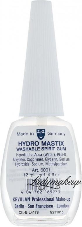 HYDRO MASTIX - Hydro Spirit Gum marki KRYOLAN. Klej wodny. Stworzony z myślą o pracy wizażystów profesjonalnie zajmujących się charakteryzacją, ale bez problemu może być on stosowany w zaciszu domowym. Powstał na bazie wody, dzięki czemu z całej "rodziny" klejów Mastix jest najbardziej łagodny dla skóry. Jest stosowany do przyklejania elementów na krótki okres czasu lub do podtrzymania włosów przed założeniem łysiny. Równocześnie dobrze sprawdzi się podczas przyklejania zarostu oraz drobnych ozdób i brokatu na włosy, twarz i ciało. Ze względu na swoją delikatną formułę klej znacznie dłużej schnie, jednak ten proces można przyspieszyć ciepłym powietrzem np. z suszarki. Plastikowe opakowanie zostało wyposażone w pędzel z syntetycznego włosia. Do demakijażu można użyć ciepłej wody i mydła.Klej wodny. Do zarostu i brokatu. Jest delikatny dla skóry. Do przyklejania ozdób na krótki czas.SPOSÓB UŻYCIA:Nałóż cienką warstwę Hydro Mastix. Pozostaw do wyschnięcia, do momentu, aż będzie prawie suchy i mocniej klejący. Następnie zaaplikuj ozdoby na warstwę kleju.