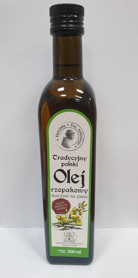 Olej Rzepakowy Tradycyjny Tłoczony na Zimno 500ml - Specjały Św. Antoniego Opis produktu Olej rzepakowy tłoczony na zimno dzięki zastosowaniu opatentowanej technologii tłoczenia, wyłącznie ze specjalnie wyselekcjonowanych i kontrolowanych ziaren rzepaku, a także co najważniejsze bez zastosowania …