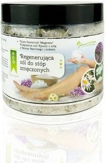 Podaruj swoim stopom regenerującą, odżywczą kąpiel. Sól magnezowa Epsom i sól z Morza Martwego to znane i lubiane składniki kosmetyków do pielęgnacji skóry. W składzie Regenerującej soli do stóp zmęczonych znajdziemy również zioła (lawenda lekarska, rumianek, krwawnik, rozmaryn). Sole: Epsom i z Morza Martwego pielęgnują zmęczone stopy, poprawiają stan skóry i łagodzą stres i napięcie. Zioła zawarte w produkcie sprawiają, że skóra staje się miękka i elastyczna, wpływają na ukrwienie oraz redukują podrażnienia. Sposób użycia: Zalej wrzątkiem 30-50 g soli i odczekaj kilka minut. Po upływie tego czasu wlej do naczynia z gorącą, ale nie wrzącą wodą i mocz stopy przez około 15-20 min. Po zakończeniu czynności, nie wycieraj stóp. Pozostaw do wyschnięcia. Taki schemat działania pozwala m.in. na skuteczniejsze wchłanianie i przyswajanie dobroczynnych minerałów zawartych w produkcie.