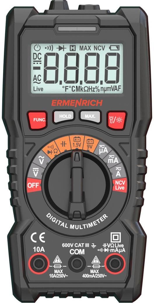 Uniwersalny miernik cyfrowy Ermenrich Zing TC13 to wielofunkcyjne przenośne narzędzie do testowania sieci elektrycznych i pomiaru charakterystyki sygnału elektrycznego. Urządzenie jest przeznaczone do profesjonalnego użytku dla pracowników technicznych, ale może być również przydatne podczas prac wykonywanych w domu. Oprócz napięcia, natężenia i rezystancji, Ermenrich Zing TC13 może mierzyć pojemność elektryczną, częstotliwość i cykl pracy. Tryb pracy można wybrać ręcznie za pomocą przełącznika obrotowego. Limity pomiaru są automatycznie ustawiane przez urządzenie. Jest to urządzenie True RMS, czyli obliczenia są oparte na formule True RMS. Zwiększa to dokładność i precyzję pomiarów zmiennych w porównaniu ze standardowymi modelami. Urządzenie ma funkcję zatrzymania wyników pomiarów na ekranie, która ułatwia wykonywanie pomiarów. Jest ona przydatna w sytuacjach, w których pozycja urządzenia sprawia, że obserwowanie ekranu jest niewygodne. Funkcja zatrzymania wyników pomiarów na ekranie pozwala „zamrozić" dane i sprawdzić je później. Urządzenie umożliwia również zapis wartości maksymalnych. Za pomocą miernika Ermenrich Zing TC13 można testować diody, lokalizować usterki sieci (zwarcia i przerwy w obwodach), wyszukiwać ukryte przewody pod napięciem i sprawdzać stan akumulatorów. Wbudowana latarka ułatwia pracę w warunkach słabego oświetlenia. Uniwersalny miernik jest zasilany standardowymi bateriami. Najważniejsze cechy: Uniwersalny miernik True RMS z ręcznym wyborem trybu i automatycznym ustawianiem limitów pomiaru Pomiar napięcia, natężenia prądu, rezystancji, pojemności elektrycznej, częstotliwości i cyklu pracy Test ciągłości obwodów, testowanie diod, bezkontaktowe wykrywanie napięcia, test akumulatora Funkcja zatrzymania wyników pomiarów na ekranie i zapis wartości maksymalnych Wbudowana latarka, zasilanie bateriami i funkcja automatycznego wyłączania, aby oszczędzać energię Zawartość zestawu: Uniwersalny miernik cyfrowy Sondy Instrukcja obsługi i karta gwarancyjna Parametry: Marka: Ermenrich EAN: 5905555017594 Rozmiar opakowania (dł. x szer. x gł.): 16x11x5 cm Masa przesyłki: 0.34 kg Funkcje i właściwości Testowanie diod: tak Bezkontaktowe wykrywanie napięcia (NCV): tak True RMS: tak Funkcja wstrzymania: tak Test ciągłości obwodów: tak Zakres wyświetlacza: 4000 Podświetlenie wyświetlacza: tak Latarka: tak Wskaźnik niskiego poziomu naładowania baterii: tak Automatyczne wyłączanie: tak Test akumulatora (1,5 V/9 V): tak Wybór limitu pomiaru: automatyczny Funkcje podstawowe Woltomierz Amperomierz Omomierz Miernik pojemności elektrycznej Miernik częstotliwości Miernik cykli pracy Limity pomiarowe Limit pomiaru napięcia DC: 400 mV/4 V/40 V/400 V/600 V: błąd ±(0,5%+3) Limit pomiaru napięcia AC: 400 mV/4 V/40 V/400 V/600 V: błąd ±(1,0%+3) Limit pomiaru natężenia prądu DC: 400 µA/4000 µA/40 mA/400 mA: błąd ±(1,2%+3), 10 A: błąd ±(2,0%+3) Limit pomiaru natężenia prądu AC: 400 µA/4000 µA/40 mA/400 mA: błąd ±(1,5%+3), 10 A: błąd ±(2,0%+3) Limit pomiaru rezystancji: 400 Ω/4 kΩ/40 kΩ/400 kΩ/4 MΩ/40 MΩ: błąd ±(1,0%+3) Limit pomiaru pojemności elektrycznej: 10 nF/100 nF/1 µF/10 µF/100 µF/1 mF/10 mF: błąd ±(4,0%+5), 100 mF: błąd ±(5,0%+5) Limity pomiaru częstotliwości: 10 Hz/100 Hz/1 kHz/10 kHz/100 kHz/1 MHz/10 MHz: błąd ±(1,0%+3) Zakres pomiaru cyklu pracy: 1-99%: błąd ±(3,0%+3) Pojemność przepustowa: 40-1 kHz Funkcja wartości granicznej (min./maks.): tak (tylko wartości maksymalne) Dodatkowe informacje Kategoria przepięciowa: KAT III 600 V Wyświetlacz: LCD Normy bezpieczeństwa: EN61010-1,-2-030; EN61010-2-033; EN61326-1 Zasilanie: 2 baterie AAA (sprzedawane osobno)