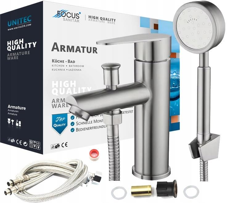 WYSOKIEJ JAKOŚCI BATERIA PRYSZNICOWA STOJACA ZE SŁUCHAWKĄ ORAZ WĘŻEM. Kompletny zestaw montażowy, w kolorze stalowym. Model PREMIUM z serii FOCUS SANITAR Nowe tendencje w architekturze, modzie i stylu życia wpływają na to, jak wyglądają i zmieniają się współczesne wnętrza. One z kolei modyfikują nasze przyzwyczajenia i to, jak z nich korzystamy. Coraz częściej łazienki i kuchnie stają się wielofunkcyjnymi salonami – przy ich urządzaniu wyrażamy naszą osobowość i pokazujemy, co naprawdę jest dla nas ważne. Staranny proces produkcji i wysoka jakość użytych materiałów zapewni bezproblemowe użytkowanie przez długi czas. Model zaprojektowany w nowoczesnym, ale klasycznym stylu sprawdzi się w każdym wnętrzu. Bateria charakteryzuje się bardzo dużą odpornością na zarysowania i wysokie temperatury. Modele PREMIUM z serii FOCUS SANITAR z powodzeniem sprzedawane na rynku niemieckim. Dane techniczne ▶️ Kolor: stal ▶️ Ceramiczna głowica ▶️ Wykonana ze stopów cynku i mosiądzu ▶️ Wymiary baterii znajdują się na obrazku obok ▶️ Wąż prysznicowy o długości 120 centymetrów w zestawie ▶️ Uchwyt na słuchawkę prysznicową wraz z zestawem montażowym ▶️ Uszczelki, rozetki oraz krzywki 3/4" na 1/2" ▶️ Standardowy rozstaw regulowany na krzywkach od 130 do 170mm Towar nowy, wysokiej jakości, bez wad. Zapakowany w estetyczne opakowanie! Prezentujemy Państwu elegancką i stylową baterię wannowo-prysznicową. Model zaprojektowany w nowoczesnym, ale klasycznym stylu sprawdzi się w każdym wnętrzu. W zestawie otrzymają państwo wszystkie niezbędne elementy do zamontowania baterii: dwa wężyki, uszczelki oraz śrubki. Prosty i szybki montaż bez pomocy hydraulika ⚡️⚡️ Nasze baterie to przede wszystkim wygoda użytkowania, a także nieoczywista forma, która swoim designem doskonale wpisuje się w najnowsze trendy Dzięki zastosowaniu nowatorskiej technologii bateria umożliwia precyzyjną regulację ilości przepływu i temperatury wody. Powierzchnia baterii została wykonana z najwyższej jakości chromu charakteryzującego się wysokim połyskiem oraz odpornością na odbarwienia i zmatowienia. Model, który wyróżnia się ponadprzeciętną funkcjonalnością. Świetnie sprawdzi się w domowej łazience, a także w miejscach użyteczności publicznej takich jak salony kosmetyczne, biura czy inne pomieszczenia usługowe.