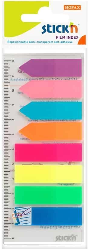 Zakładki indeksujące w 8 kolorach neonowych.Zakładki indeksujące w 8 kolorach neonowych: niebieskim, zielonym, żółtym, różowym, pomarańczowym, jasnoniebieskim, jasnoróżowym i filoletowym – 8 bloczków po 25 zakładek o wymiarach 45 × 12 mm. 4 kolory zakładek – w kształcie strzałki. Opakowanie zawiera dodatkowo 12 cm linijkę. Zakładki umożliwiają łatwe zaznaczanie i szybkie odnajdywanie ważnych informacji. Można je wielokrotnie odrywać i przyklejać w innych miejscach.