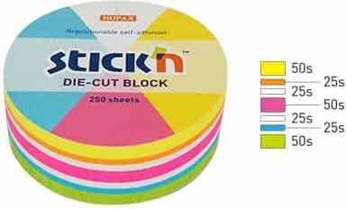 Notes samoprzylepny kostka w kształcie koła o wymiarach 67 × 67 mm.Notes samoprzylepny kostka w kształcie koła o wymiarach 67 × 67 mm. Zawiera mix kolorów neonowych: po 50 karteczek w kolorze żółtym, różowym, zielonym i białym (w dwóch częściach po 25), po 25 karteczek w kolorze pomarańczowym i …