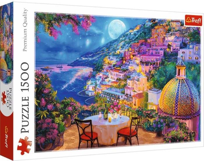 Trefl Puzzle 1500el. Randka w Positano 26218 Puzzle Randka w Positano składają się z 1500 elementów i przedstawiają widok na nadmorskie miasto w świetle księżyca. Po ich ułożeniu powstanie obrazek o wymiarach 850x580 mm. Produkt został wykonany z wysokiej jakości materiałów, z zastosowaniem …
