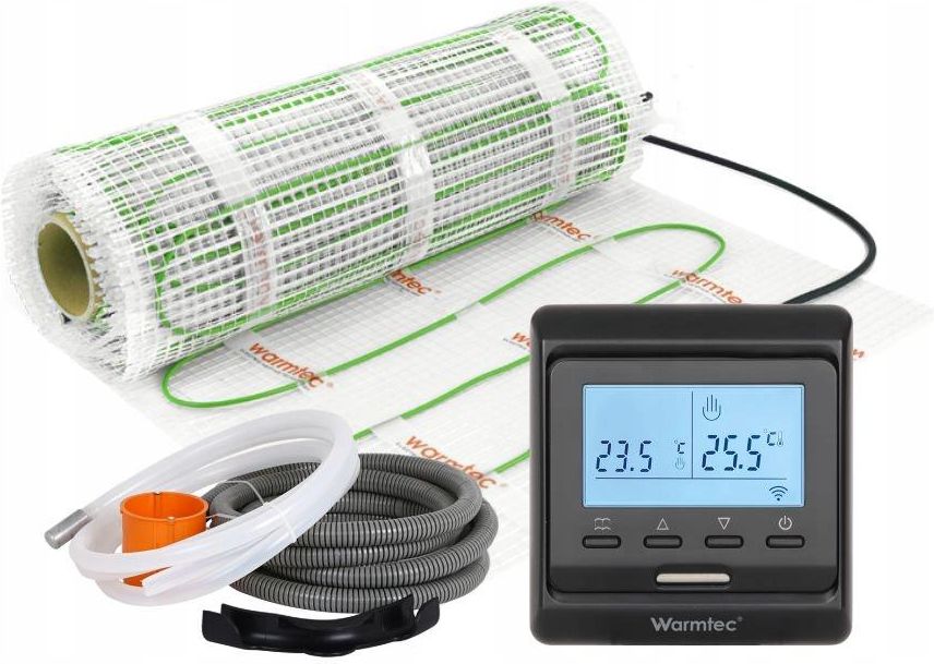 Zestaw elektrycznego ogrzewania podłogowego Warmtec DSE-35/T510 czarny 3,5m² (100W/m²) Zapewnij komfort cieplny sobie oraz Twoim bliskim Zestaw ogrzewania podłogowego Warmtec DSE z regulatorem T510 eliminuje dyskomfort występujący podczas chłodnego poranka, kiedy posadzka w całym mieszkaniu pozostaje zimna. Poruszanie się po ciepłej posadzce jest dużo bardziej korzystne dla zdrowia. Możliwość regulacji temperatury pozwala na jej precyzyjne ustawienie według własnych preferencji. Sterowanie za pomocą Wi-Fi dzięki aplikacji mobilnej Pozwala na pełną kontrolę ustawień dla danych pomieszczeń z poziomu aplikacji przy użyciu smartfona lub tabletu. W celu uzyskania takiej możliwości należy pobrać i zainstalować dedykowaną aplikację, która jest darmowa. Łatwo w ten sposób tuż przed samym wyjściem zaplanować program przy użyciu smartfona, by móc cieszyć się ciepłem od razu po powrocie do domu. Zmiana ustawień może być dokonywana w każdej chwili oraz z dowolnego miejsca - wystarczy dostęp do internetu. Co wyróżnia regulator temperatury Warmtec T510? ✔️ sterowanie Wi-Fi - zarządzanie ogrzewaniem z dowolnego miejsca. Wystarczy dostęp do internetu, by móc połączyć się z dedykowaną aplikacją. ✔️ możliwość ustawiania bloków czasowych - pozwala na określenie temperatury dla danych dni tygodnia oraz godzin, ✔️ funkcja tymczasowego nadpisania temperatury w trybie programowalnym, ✔️ funkcja otwartego okna - jeśli czujnik wykryje nagły spadek temperatury, to regulator wstrzyma pracę mając na uwadze ograniczenie zużycia energii, ✔️ funkcja monitorowania zużycia energii w aplikacji mobilnej - większa kontrola nad kosztami ogrzewania, ✔️ możliwość blokady przycisków - to doskonała ochrona przed niepożądaną zmianą ustawień, ✔️ tryb antyzamarzaniowy - idealne rozwiązanie, by podczas mrozów nie doprowadzić do nadmiernego wychłodzenia, ✔️ start adaptacyjny - ogrzewanie zostanie uruchomione odpowiednio wcześniej, by w momencie rozpoczęcia danego bloku czasowego panowała już określona temperatura, ✔️ podtrzymanie pamięci w przypadku zaniku zasilania, ✔️ tryb urlopowy - doskonałe rozwiązanie podczas planowanej dłuższej nieobecności, ✔️ tryb czuwania - aktywacja następuje podczas bezczynności urządzenia, ✔️ 2 czujniki: urządzenie posiada jeden czujnik znajdujący się wewnątrz urządzenia. Natomiast drugi czujnik, to czujnik podłogowy na dołączonym przewodzie, ✔️ wybór czujnika odczytu - w ustawieniach istnieje możliwość określenia, z którego czujnika regulator ma dokonywać odczytu temperatury, ✔️ podwyższony stopień ochrony IP21 - możliwość instalacji w miejscach o podwyższonej wilgotności, ✔️ autodiagnostyka awarii - pomoże w przypadku wystąpienia problemów. Możliwości programowania regulatora Warmtec T510 Tryb programowalny - zaplanowanie pracy urządzenia na poszczególne dni: 5+1+1 - zaprogramowanie jednakowych ustawień w dni robocze (od poniedziałku do piątku) oraz innych dla soboty i niedzieli, 7 - ustawienia na każdy dzień tygodnia są identyczne. Dostępna jest także możliwość ręcznego sterowania, co daje użytkownikowi pełną kontrolę nad temperaturą panującą w pomieszczeniu. Mata grzejna Warmtec DSE Jednostronne zasilanie - pozwala na definitywne wyznaczenie miejsca, w którym będzie znajdowało się podłączenie zasilania. Mata o mocy 100 W/m2 charakteryzuje się wysoką wydajnością, a to pozwala na szybkie osiągnięcie odpowiedniej temperatury powierzchni. Przewód o grubości 3,6mm nie spowoduje zbyt wielkich zmian w kwestii dotychczas przyjętej wysokości podłogi, a zdecydowanie wpłynie na poprawę komfortu cieplnego. Świetnie sprawdzi się w niesymetrycznych pomieszczeniach, ponieważ można jej nadać odpowiedni kształt. Należy pamiętać jednak o utrzymaniu odpowiedniej odległości między przewodami znajdującymi się na macie oraz nie dopuścić do ich uszkodzenia. Powierzchnia przylegająca do podłoża jest samoprzylepna. Ta cecha ułatwi montaż, ponieważ mata nie będzie się przesuwała podczas rozkładania w pomieszczeniu oraz umożliwi to wyliczenie z dużą dokładnością ilości potrzebnego materiału. Niewiarygodnie łatwy montaż dzięki wszystkim niezbędnym akcesoriom Aby całkowicie ułatwić montaż producent do zestawu z matą grzejną oraz regulatorem temperatury dołączył wszystkie niezbędne akcesoria do montażu ogrzewania podłogowego. Zawartość zestawu: regulator temperatury Warmtec T510 czarny, mata grzejna Warmtec DSE, czujnik temperatury NTC 10 kΩ (dł. 3m), łuk prowadzący do rurki ochronnej czujnika podłogowego, puszka podtynkowa pod regulator, peszel ochronny przewodów zasilających (dł. 3 m), rurka ochronna podłogowego czujnika temperatury (dł. 2,5 m), instrukcja obsługi i montażu maty oraz regulatora. Specyfikacja techniczna regulatora Warmtec T510: model: T510, kolor: czarny, rodzaj: programowalny, montaż regulatora: podtynkowy (w puszkę), zasilanie regulatora: sieciowe (230 V), typ: pokojowy, wi-fi: tak, wyświetlacz: LED, stopień ochrony regulatora: IP21, rodzaj czujnika temperatury: powietrzny i podłogowy, regulacja temperatury: elektronicznie, zakres regulacji temp. powietrza: od +5°C do +40°C, histereza: od 0,5°C do 3°C, max. obciążenie regulatora: 16 A, szerokość: 8,6 cm, wysokość: 9 cm, głębokość: 4,3 cm. Specyfikacja techniczna maty grzejnej Warmtec DSE-35: zastosowanie: do użytku wewnętrznego, przeznaczenie: pod płytki, moc jednostkowa: 100 W/m2, powierzchnia grzewcza: 3,5 m2, wymiar grzewczy: 0,5 x 7 m, wymiar fizyczny: 0,48 x 7 m (+/- 2 cm), moc całkowita: 350 W, rezystancja maty: 151,1 (Ω), napięcie zasilania: 230 V, typ zasilania: jednostronne, grubość maty: 3,6 mm, długość przewodu zasilającego: 2,5 m, podkład: siatka z tworzywa sztucznego z klejem, stopień ochrony: II, IPX7, minimalna temperatura insta