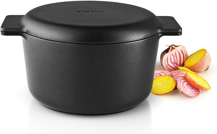 Lubisz żeliwne naczynia kuchenne, ale przeszkadza Ci ich dodatkowa waga? W takim razie seria Nordic kitchen duńskiej marki Eva Solo została stworzona właśnie dla Ciebie! Patelnie i garnki w naturalnym żelaznym designie, jednak wykonane z lekkiego i wytrzymałego aluminium z wewnętrzną powłoką nieprzywierającą Slip-Let®. Seria została zaprojektowana w bardzo prostym i rustykalnym stylu. Wykończenie z czarnego aluminium wygląda elegancko. Nordycka elegancja, która pasuje do wszystkich potraw i kuchni. Dzięki dużym, płaskim uchwytom, garnek jest łatwy i bezpieczny w obsłudze nawet w rękawicach kuchennych. Zaletą aluminiowych naczyń Nordic kitchen jest nie tylko ich niska waga, ale również równomierne rozprowadzanie ciepła. Specjalna magnetyczna podstawa przeznaczona jest do wszystkich rodzajów płyt grzewczych, w tym indukcji. Wysokiej jakości powłoka nieprzywierająca Slip-Let® nie zawiera PFOA ani PTFE. Nieprzywierająca powierzchnia jest szczególnie przydatna do gotowania i smażenia delikatnych potraw, a także sprawia, że naczynia kuchenne Nordic kitchen są łatwe w czyszczeniu. Garnek o pojemności 3 litrów z wytrzymałego aluminium o wyglądzie żeliwa Optymalny do przygotowywania zup i różnych duszonych potraw Nadaje się również do pieczenia lub duszenia mięsa i warzyw Wytrzymały, lekki materiał ze specjalną powłoką Szybko i równomiernie rozprowadza ciepło Nadaje się również do pieczenia w piekarniku Nieprzywierająca 4-warstwowa powierzchnia Slip-Let® Dla zdrowego gotowania z niewielką ilością tłuszczu Płaskie uchwyty zapewniają pewny chwyt, nawet jeżeli użyjesz rękawic kuchennych Wykonane bez PFOA i PTFE Nadaje się do wszystkich źródeł ciepła, w tym indukcji Łatwy do czyszczenia, nadaje się do mycia w zmywarce Podczas używania: Zawsze używaj płyty grzewczej, która najlepiej pasuje do średnicy Twojego naczynia Nie wystawiaj naczynia na działanie zbyt wysokiej temperatury, gdy olej w naczyniu zacznie skwierczeć, jest ono gotowe do użycia Podczas gotowania na elektrycznej kuchence indukcyjnej garnki i patelnie nie mogą być puste. Naczynia szybko się nagrzewają, może to spowodować ich uszkodzenie Do naczyń z powłoką nieprzywierającą Slip-Let® należy używać wyłącznie drewnianych lub plastikowych przyborów kuchennych, które ich nie uszkodzą. Po użyciu: Naczynia można czyścić za pomocą detergentów i miękkiej szczotki lub gąbki do naczyń Nigdy nie używać drucianych ściereczek ani ściernych środków czyszczących!
