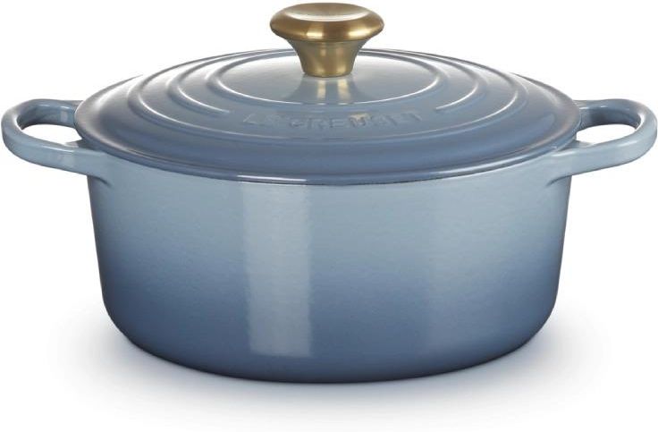 Brytfanna żeliwna Le Creuset 24 cm Chabrowa - Chambray Naczynie o średnicy 24 cm w zestawie z pokrywą, której gałka jest odporna na wysokie temperatury, co zapewnia pewny chwyt podczas jej podnoszenia. Dzięki swojej uniwersalności, naczynie to działa na wszystkich płytach grzewczych, w tym na kuchence indukcyjnej.