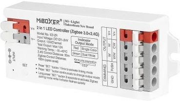 Odbiornik LED radiowy 2w1 MONO/CCT - 12-24V DC 12A- Zigbee 3.0 - Mi-Boxer, jest to małych rozmiarów urządzenie służące do sterowania oświetleniem LED monochromatycznym MONO oraz ze zmienną temperaturą barwową CCT. Urządzenie zostało skonstruowane w sposób umożliwiający zmianę temperatury barwowej podłączonej taśmy LED CCT bądź natężenia jasności dla taśmy jednokolorowej MONO, poprzez wykorzystanie protokołu komunikacji zigbee 3.0.