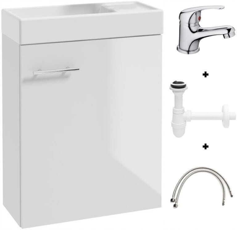 Szafka łazienkowa z umywalką 50x70 cm biała z baterią i syfonem Small - komplet ✅ Zestaw szafka z umywalką o szerokości 50 cm to idealne rozwiązanie dla małych jak i zarówno dużych łazienek. Szafka wykonana jest z wysokiej jakości płyty laminowanej, co gwarantuje trwałość i odporność na uszkodzenia. Dostępna w kolorze białym, co nadaje pomieszczeniu eleganckiego charakteru. Umywalka z ceramiki jest łatwa w utrzymaniu czystości i odporna na działanie chemikaliów. Szafkę łazienkową można umieścić w dowolnym miejscu w pomieszczeniu. Szafka jest wisząca, co sprawia, że jej montaż jest wyjątkowo łatwy i szybki. Mebel posiada chromowane uchwyty, co nadaje całości elegancji. W skład zestawu wchodzą: ✅ Umywalka 50 ✅ Szafka pod umywalkę 50 ✅ Korek gumowy ✅ Syfon umywalkowy 50mm ✅ Bateria jednouchwytowa chrom (długość wylewki około 10 cm) ✅ Wężyki do baterii 3/8 cala, 34 cm, z uszczelkami Parametry: ✅ Seria: Small ✅ Zastosowanie: Meble łazienkowe ✅ Typ: Szafka wisząca ✅ Kolor dominujący: Biały ✅ Kolor Frontu: Biały ✅ Kolor Korpusu: Biały ✅ Szerokość szafki: 50 cm ✅ Wysokość szafki: 70 cm ✅ Głębokość: 23 cm ✅ Wykonanie umywalki: Ceramika ✅ Wykonanie korpusu: Płyta wiórowa laminowana