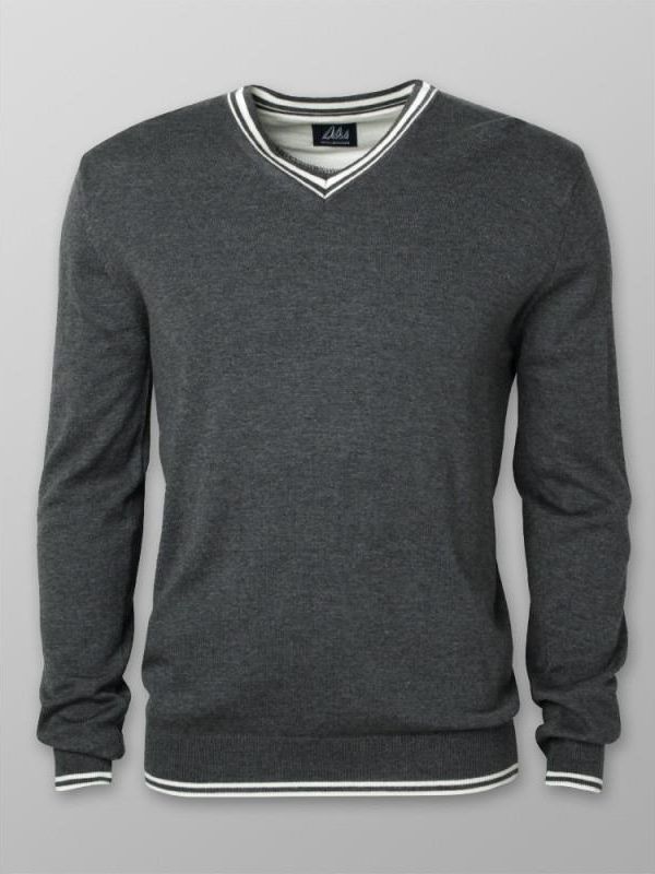 Szary sweter męski z kontrastami i dekoltem w szpic
