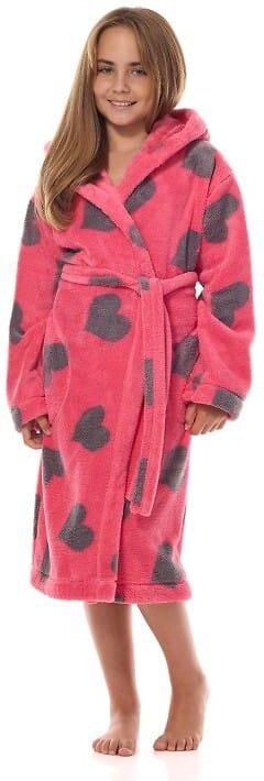 Szlafrok dziewczęcy wykonany z miękkiego poliestru w kolorze amarantowym w grafitowe serduszka. Szlafrok posiada kaptur oraz kieszeni, wiązany jest w pasie, długość za kolano. Skład: 100% poliester PRODUKT POLSKI