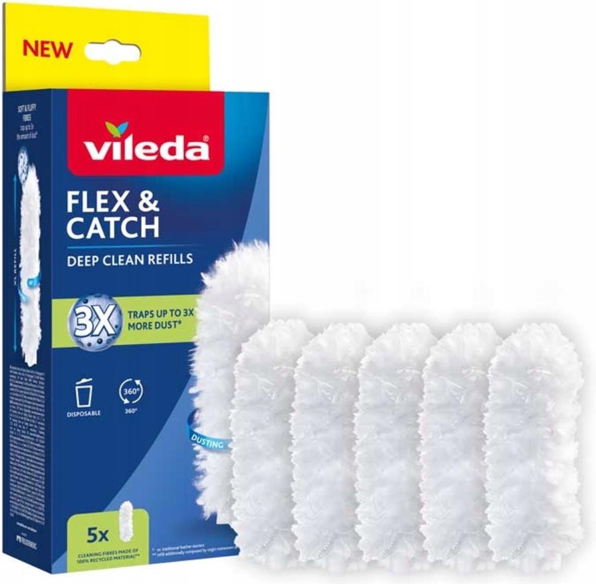 Wkłady do miotełki do kurzu Vileda Flex & Catch 5 szt. Wkład do miotełki Vileda Flex & Catch skutecznie usuwa kurz, brud i włosy, pozostawiając powierzchnie lśniąco czyste. Wkład został zaprojektowany z myślą o skuteczności sprzątania i zrównoważonym rozwoju. Wkład 360° jest otoczony włóknami dookoła, dzięki czemu kurz znika z każdej strony. Z kolei technologia Dust Lock gwarantuje, że kurz pozostaje na miotełce, a nie w powietrzu. Włókna wkładu pochodzą w 100% z recyklingu.* * Wkład składa się również z nieprzetworzonych materiałów i oleju. Usuwa nawet 3 razy więcej kurzu Miotełka do kurzu Vileda Flex & Catch opatentowanej konstrukcji zatrzymuje nawet 3 razy więcej kurzu niż tradycyjne miotełki, zapewniając dokładne i skuteczne sprzątanie w każdym zakamarku. Koniec z przesuwaniem kurzu z miejsca na miejsce – teraz pozbędziesz się go całkowicie ze wszystkich przestrzeni w domu. Włókna 100 % z recyklingu Zrównoważone sprzątanie możliwe jest dzięki wkładom z włóknami wykonanymi z materiału w 100% z recyklingu*, które podnoszą jakość sprzątania i wspierają ochronę planety. Konstrukcja 360 – włókna dookoła wkładu gwarantują, że kurz znika z każdej strony, a wbudowany haczyk utrzymuje wkład na miejscu. * Wkład składa się również z nieprzetworzonych materiałów i oleju. Wkłady 360 Wkłady do miotełki Flex & Catch, mają włókna czyszczące dookoła i w przeciwieństwie do wkładów 180°, zapewniają skuteczniejsze czy szybsze sprzątanie. Zatrzymuje kurz Wkład Flex & Catch usuwa nawet 3 razy więcej kurzu (w porównaniu z tradycyjnymi miotełkami). Skutecznie wychwytuje i zatrzymuje kurz na włóknach. Dzięki niemu naprawdę odkurzysz, a nie tylko przesuniesz kurz w inne miejsce. Sprawdzi się do urządzeń elektronicznych, żaluzji oraz dotrze w trudno dostępne miejsca. Większy wkład = większa powierzchnia czyszczenia Ciesz się szybszym i skuteczniejszym sprzątaniem dzięki wkładom większym o 20% (w porównaniu do wiodącego konkurenta). Jak używać? To takie proste! 1) Potrząśnij wkładem Wyjmij wkład z opakowania i potrząśnij, by napuszyć włókna. 2) Załóż wkład na główkę i zaczep o haczyk Załóż wkład na główkę i zaczep go o haczyk, aby zawsze był na miejscu i nie zsuwał się podczas odkurzania. 3) Gotowe! Docieraj z łatwością do każdego zakamarka. Sprzątanie nigdy nie było tak proste! Kompatybilny Pasuje do krótkiej i długiej rączki