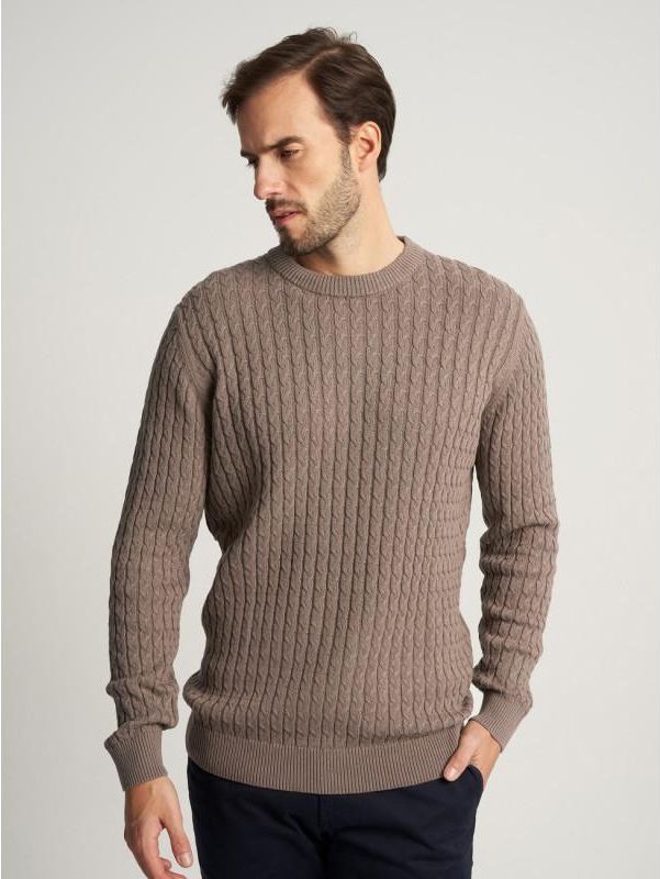 Sweter męski Willsoor Kolor: ziemisty w warkocze Dekolt: okrągły (typ O-neck) Skład: 100% bawełna Rękawy wykończone ściągaczem Dół wykończony ściągaczem Elastyczna tkanina, prosty fason Klasyczny ścieg w warkocze Jakość: pierwsza Gwarancja: 24 m-ce