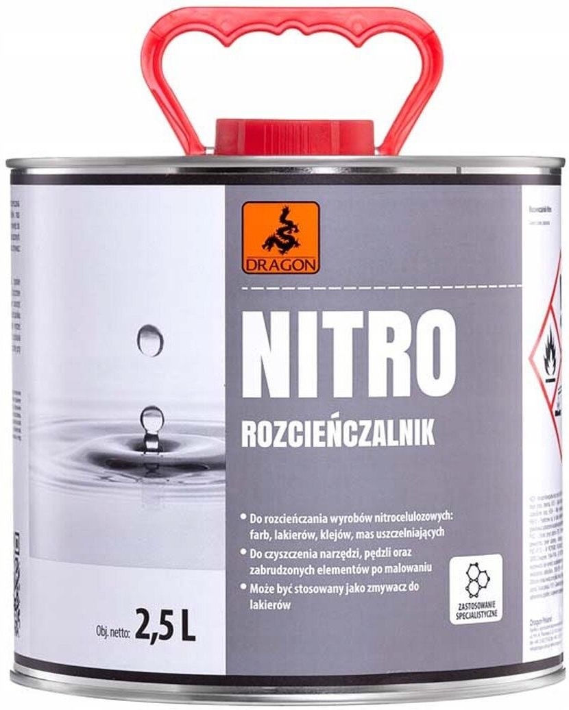 DRAGON ROZPUSZCZALNIK NITRO ROZCIEŃCZALNIK 2,5 L DO FARB I LAKIERÓW PARAMETRY TECHNICZNE Ilość: 1 szt Pojemność: 2,5 l Kolor: Bezbarwny Gęstość: 0,73 – 0,95 g/cm³ w 20°C Marka: Dragon Profesjonalna moc do zadań specjalnych Rozcieńczalnik Dragon to produkt, który daje pewność działania nawet tam, gdzie inne rozwiązania zawodzą. Pozwala pracować szybciej, dokładniej i bez zbędnych poprawek, oszczędzając czas oraz materiały. Karta produktu dostępna jest do pobrania pod opisem aukcji. NIEZASTĄPIONY W WARSZTACIE I LAKIERNI Rozcieńczalnik Nitro to niezawodne rozwiązanie do zastosowań remontowych, lakierniczych i warsztatowych. Produkt przeznaczony do pracy z farbami i lakierami nitrocelulozowymi, zapewniając im odpowiednią konsystencję oraz lepsze właściwości aplikacyjne. Dzięki wysokiej jakości składu rozcieńczalnik poprawia rozlewność wyrobów nitro, ułatwia ich nanoszenie i nie powoduje żółknięcia powłoki. Niska zawartość siarki sprawia, że produkt jest bezpieczny dla rozcieńczanych materiałów i zachowuje ich pierwotne właściwości. ZASTOSOWANIE rozcieńczanie farb i lakierów nitrocelulozowych do lepkości roboczej odtłuszczanie powierzchni przed malowaniem czyszczenie pistoletów lakierniczych, narzędzi i urządzeń aplikacyjnych usuwanie trudnych zabrudzeń po pracach malarskich ZALETY PRODUKTU wysoka skuteczność działania bezbarwny i gotowy do użycia wydajny – idealny do intensywnej pracy nie wpływa negatywnie na kolor farby polecany zarówno dla profesjonalistów, jak i wymagających użytkowników Uwaga! Zastosowanie niezgodne z przeznaczeniem i sposobem użycia może prowadzić do zagrożenia życia lub zdrowia. W trakcie i po prowadzeniu prac pomieszczenie wietrzyć.