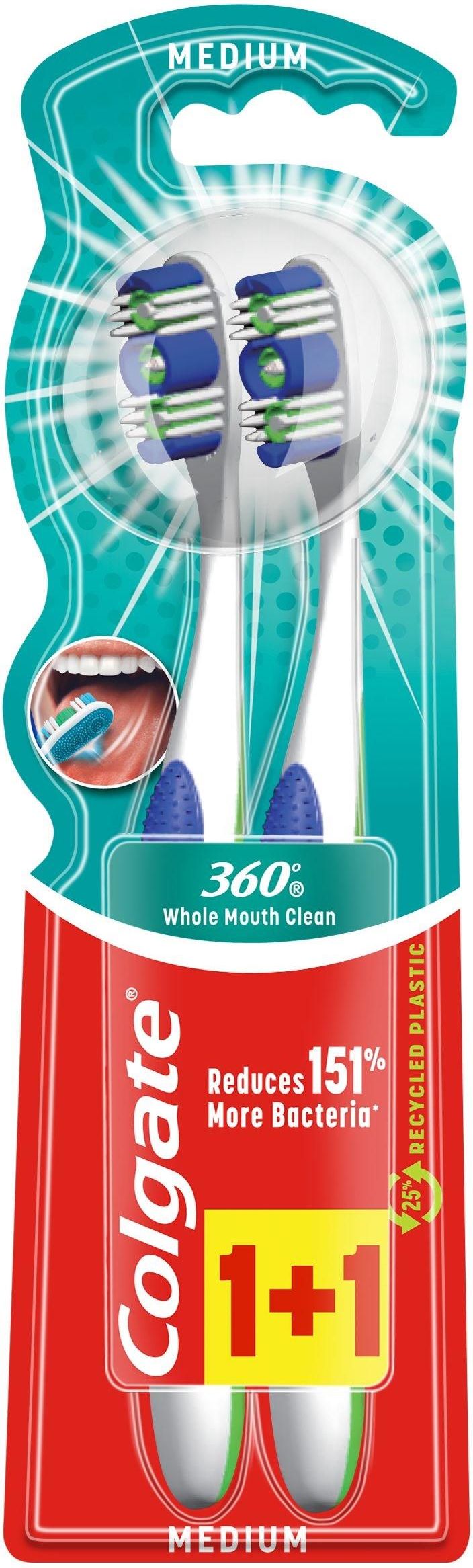 Colgate 360° Whole Mouth Clean Szczoteczka do zębów średnia MEDIUM 2 sztuki Szczoteczka do zębów Colgate 360 Whole Mouth Clean. Czyści więcej niż tylko zęby. Powierzchnia czyszcząca język i wewnętrzną stronę policzków. Usuwa z jamy ustanej ponad 151% więcej bakterii*. Specjalnnie zaprojektowane …