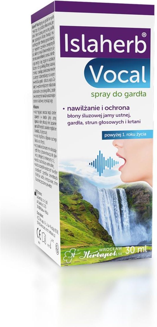 Islaherb Vocal Wyrób medyczny przeznaczony do nawilżania i ochrony błony śluzowej jamy ustnej, gardła, krtani i strun głosowych. Zawiera naturalny ekstrakt z porostu islandzkiego, bogaty w substancje śluzowe, które tworzą na błonie śluzowej ochronny film, zabezpieczając ją przed podrażnieniami i przesuszeniem. Dzięki temu łagodzi uczucie suchości, chrypki i bólu gardła, wspierając regenerację błony śluzowej. Preparat jest szczególnie polecany dla osób narażonych na nadmierne obciążenie głosu, nauczycieli, śpiewaków, lektorów, a także dla tych, którzy często przebywają w pomieszczeniach o suchym lub klimatyzowanym powietrzu. Produkt może być stosowany również u dzieci powyżej 1. roku życia.