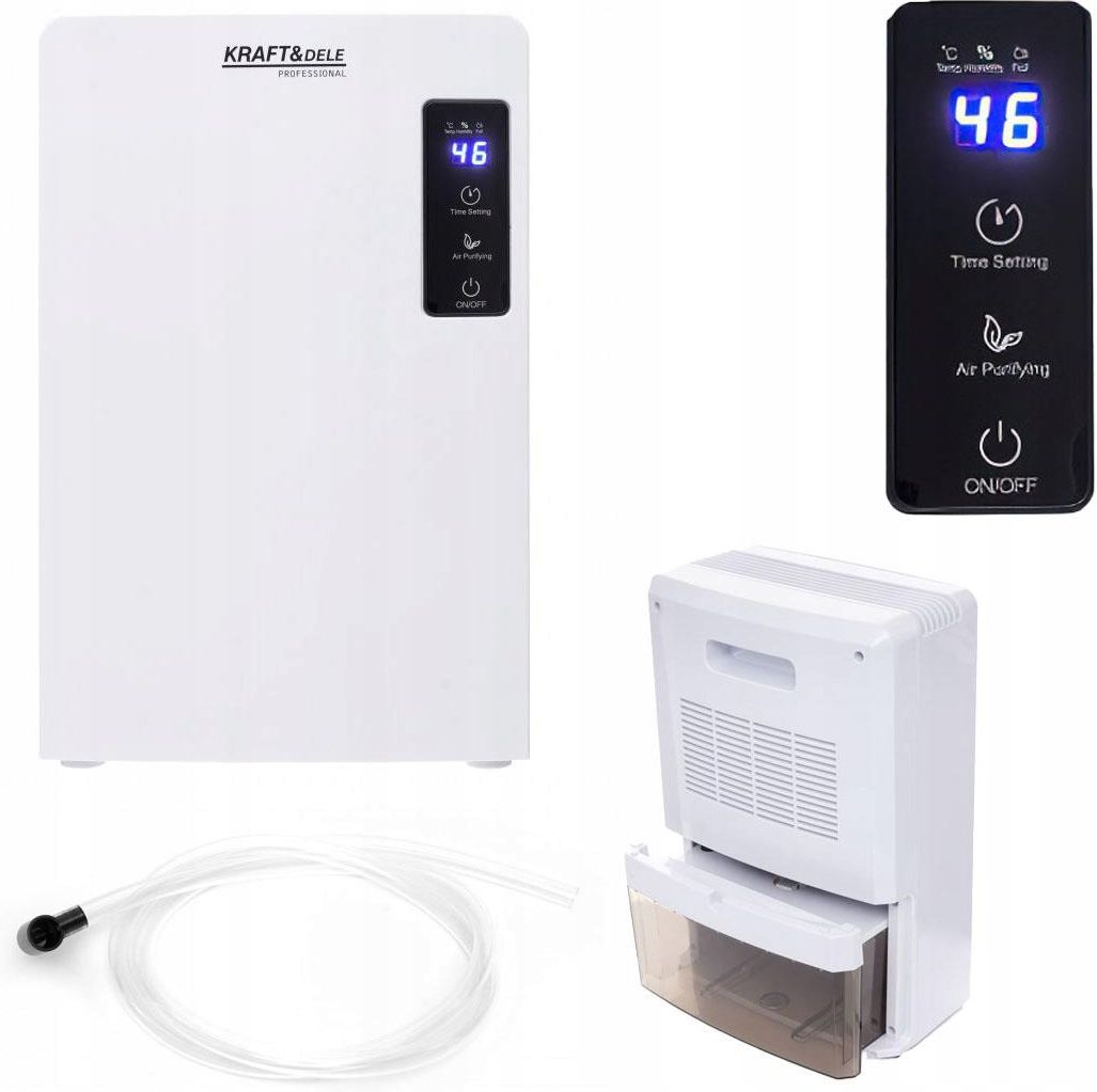WYDAJNY OSUSZACZ POWIETRZA POCHŁANIACZ WILGOCI 2200ml CICHY 90W Model: KD10587 Producent: KRAFT&DELE Osuszacz powietrza marki KRAFT&DELE to niezwykle przydatne urządzenie. Skutecznie pochłania wilgoć z małych pomieszczeń np. łazienki, biura czy pokoju, zapewniając lepszą jakość powietrza oraz zapobiegając tworzeniu się pleśni. DANE TECHNICZNE Wydajność: 700ml/24h -30°C, 80% Element chłodzący: termoelektryczny moduł Peltiera Napięcie zasilania: 220 - 240V Pobór mocy: 90W Wyjmowany zbiornik na wodę: 2200 ml Wymiary produktu: 24x13x36cm Waga: ok. 2 kg RENOMOWANY PRODUCENT, ERGONOMICZNY DESIGN, NOWOCZESNE ROZWIĄZANIA - TO CECHY WYRÓŻNIAJĄCE PREZENTOWANY PRODUKT NA TLE KONKURENCJI JEDEN PRODUKT, WIELE ZALET ✔️INNOWACYJNE ROZWIĄZANIA: Pochłaniacz wykorzystuje technologię Peltiera (bez kompresora), dzięki czemu jest lekki i cichy. ✔️SZEROKIE ZASTOSOWANIE: Dzięki niewielkim rozmiarom, świetnie sprawdzi się w małych pomieszczeniach tj. łazienka czy biuro. ✔️PRZEMYŚLANY DESIGN: Czarny kolor oraz minimalistyczna konstrukcja sprawia, że urządzenie świetnie współgra z wystrojem pomieszczenia. INTUICYJNY PANEL KONTROLNY Panel wyposażony jest w takie elementy jak: ✔️ Wskaźnik temperatury; ✔️ Wskaźnik wilgotności; ✔️ Wskaźnik wypełnienia zbiornika na wodę; ✔️ Przycisk ustawiania czasu; ✔️ Przycisk oczyszczania powietrza; ✔️ Włącznik/wyłącznik. Panel kontrolny pozwala w łatwy i czytelny sposób kontrolować parametry urządzenia.