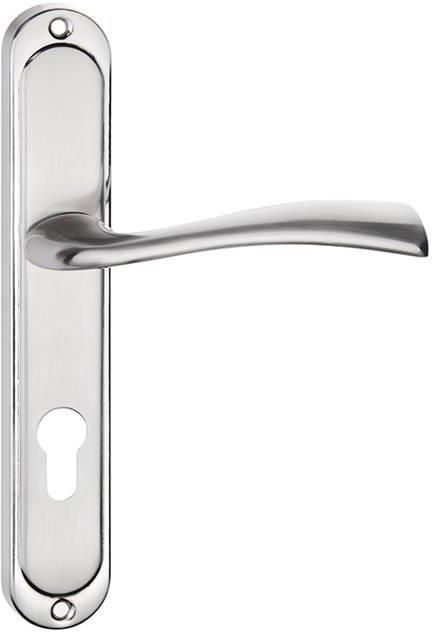 Klamka drzwiowa na szyldzie długim Rozstaw 72 mm Materiał: Znal (stop cynku i aluminium) Wykończenie: nikiel szczotkowany / patyna Wersje: na wkładkę bębenkowa / na klucz / WC / bez otworu