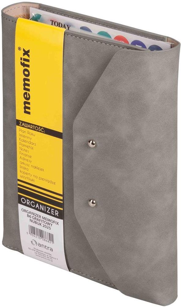 Organizer 2026 B6 nubuk grafitowy EAN: 5904210093539 SID: 3669861 Organizer 2026 B6 nubuk grafitowy Organizer B6Materiał: nubukZamknięcie: knopikiOrganizer posiada: wkład kalendarzowy 2026 (TDW tydzień do wglądu), pamiętaj, notes, finanse, adresy od A do Z, linijkę 15 cm, 3 koperty na wizytówki, 3 koperty zasuwane, zestaw 4 naklejek tematycznych,Organizer posiada miejsce na długopis oraz organizera można również dokupić inne wkłady (kategoria: wkłady do organizerów format B6).