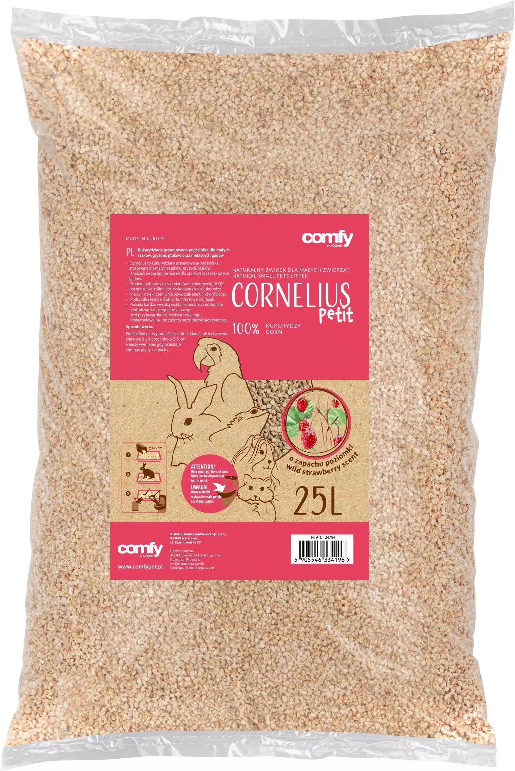 COMFY ŻWIR CORNELIUS 25L POZIOMKA CO WYRÓŻNIA NASZ PRODUKT 1✔️Wykonany w 100% z naturalnej kukurydzy, zapewniając komfort i przyjemny aromat poziomki dla Twojego pupila. Bezpyłowy i nietoksyczny, chroniąc wrażliwe łapki zwierząt przed podrażnieniami i reakcjami alergicznymi. Skutecznie chłonie wilgoć, neutralizuje nieprzyjemne zapachy i utrzymuje świeżość w klatce lub terrarium. Biodegradowalny, uniwersalny i ekologiczny produkt wyprodukowany w Europie, gwarantujący wysoką jakość. NATURALNY KOMFORT DLA TWOJEGO PUPILA! Żwir Comfy Cornelius 25L Poziomka to wysokiej jakości podłoże wykonane w 100% z naturalnej kukurydzy. Nie tylko zapewnia komfort Twojemu pupilowi, ale także delikatny aromat poziomki, który tworzy świeżą i przyjemną atmosferę w pomieszczeniu. BEZPYŁOWE I NIETOKSYCZNE ŚRODOWISKO! Ten unikalny produkt jest całkowicie bezpyłowy i nietoksyczny, co czyni go idealnym rozwiązaniem dla wrażliwych zwierząt. Nie powoduje żadnych reakcji alergicznych, chroniąc delikatne łapki Twojego pupila. WYDAJNOŚĆ I SKUTECZNOŚĆ NA NAJWYŻSZYM POZIOMIE! Żwir Comfy Cornelius skutecznie chłonie wilgoć, neutralizuje i wiąże nieprzyjemne zapachy, utrzymując świeżość w klatce, wolierce czy terrarium przez długi czas. UNIWERSALNE I EKOLOGICZNE ROZWIĄZANIE! Ten produkt nadaje się do kompostowania, co czyni go w pełni biodegradowalnym i przyjaznym dla środowiska. Można go z powodzeniem stosować jako wypełnienie klatek i wolier dla małych ssaków i ptaków, a także w terrariach dla niektórych gatunków gadów. SPECYFIKACJA Rodzaj: żwirek Marka: Comfy Nazwa handlowa: Comfy Petit Pojemność: 25 l Zastosowanie: higiena Kod producenta: 000000000000124784 Waga produktu z opakowaniem jednostkowym: 7.75 kg Przeznaczenie: dla gryzonia i królika Postać: granulat