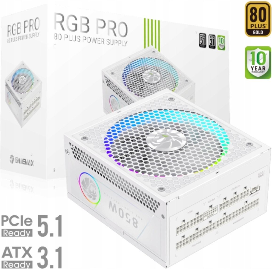 GameMax RGB PRO 850G Biały Zasilacz RGB PRO 850G WH 850W 80+ Gold ATX3.1 z wentylatorem adaptacyjnym i ARGB SYNC •Efektywność 80 Plus Gold: Zapewnia 90%+ wydajności przy typowych obciążeniach, zużyciu mocy cięcia i hałasie, zapewniając niezawodną wydajność. •Obsługa ATX3.1 & PCIe5.1: Natywne złącze 12V-2x6 zapewnia bezproblemowe zasilanie procesorów graficznych RTX 40/50, optymalizując dostarczanie i zmniejszając straty. •Adaptacyjne sterowanie wentylatorem: 14 CM wentylator automatycznie dostosowuje prędkość w oparciu o obciążenie, równoważąc efektywność energetyczną z cichą pracą. •Wysokiej Jakości Komponenty: Japońskie 105°C i solidne kondensatory gwarantują trwałość, stabilność i niezawodność podczas intensywnych zadań. •Konfigurowalne Oświetlenie RGB: 25 trybów oświetlenia z pamięcią i obsługą ARGB SYNC, umożliwiających spersonalizowane i zsynchronizowane efekty wizualne.