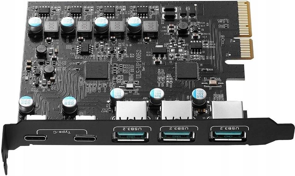 Karta rozszerzeń adapter do komputera PC PCI PCIe 3x USB Gen.2 2x USB-C Karta rozszerzeń adapter do komputera PC PCI PCIe 3x USB 2x USB-C Model: ULS-UP10052 Kontroler z interfejsem PCI-E 4X umożliwia dodanie 5 dodatkowych portów USB do Twojego komputera PC oraz umożliwia transmisję danych z prędkością do 10Gb/s: 3x USB 3.2 Gen.2 (do 10Gb/s) 2x USB-C (do 10Gb/s) Kontroler nie wymaga zewnętrznego zasilania, a dodatkowo zapewnia bezpieczeństwo oraz stabilność danych. Kompatybilność kontrolera ULS-UP10052 jest bardzo szeroka. Działa z PCIe 3.0 i 2.0 oraz współpracuje z systemami Windows 7, 8, 10 (32/64bit), MacOS (10.8.2 i nowszymi) i Linux. Kontroler jest niewielkich rozmiarów i jest niezwykle łatwy w instalacji oraz obsłudze. Cechy produktu Zapewnia dodatkowe porty do komputera PC (3x USB, 2x USB-C) Posiada interfejs PCI Express 4X Jest zgodny z gniazdami PCI Express X4, X8, X16 Umożliwia przesyłanie danych z prędkością do 10 Gb/s Nie wymaga zewnętrznego zasilania Zapewnia bezpieczeństwo i stabilność danych Jest kompatybilna z PCIe 3.0, 2.0 Współpracuje z systemami Windows 7, 8, 10 (32/64 bit), MacOS wersja 10.8.2 i nowsze, Linux, 4GB DDR RAM lub więcej Wykonana z materiału PCB Łatwa instalacja i obsługa Kompaktowy rozmiar Specyfikacja Model: ULS-UP10052 Interfejs: PCI Express 4X Ilość portów: 5 (3x USB 3.2 Gen. 2, 2x USB-C) Max. prędkość transmisji 1 portu: do 10 Gb/s Materiał: PCB Rozmiar: 15 x 13 (cm) Kolor: czarny Opakowanie zawiera 1x Karta USB 3.2 PCIe ULS-UP10052 2x Śrubki 1x Dysk CD z oprogramowaniem
