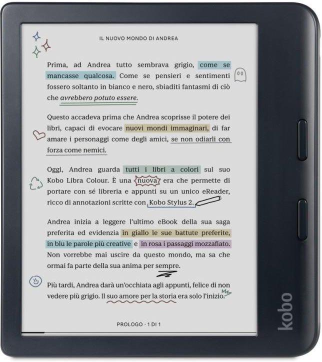 Czytnik Ebook Tablet Kobo Libra Colour 32 GB 7 Cali Czarny Dodaj barw Twoim historiom Nowa era czytania – kolorowy ekran E Ink, który pozwala cieszyć się literaturą w zupełnie nowym wymiarze. Podkreślaj cytaty, rób notatki na marginesach i zapisuj inspirujące myśli – teraz w pełnej palecie barw. Dzięki rysikowi Kobo Stylus 2 zaznaczanie i porządkowanie treści staje się niezwykle intuicyjne i wygodne. Magia kolorów w Twojej dłoni Ilustracje, grafiki i obrazy nabiorą życia – odkryj książki na nowo, wzbogacając je o dodatkowe wrażenia wizualne. Każdy e-book może stać się bardziej przejrzysty, inspirujący i osobisty. Twórz własny, kolorowy świat czytelnika Zaznaczaj, podkreślaj i oznaczaj fragmenty książek tak, jak lubisz – w ulubionych kolorach. Nadaj swoim notatkom indywidualny charakter, który będzie Ci towarzyszył podczas każdej lektury. Zacznij myśleć kolorowo 7-calowy wyświetlacz E Ink Kaleido™ 3 przeniesie Cię do świata pełnego barw, czyniąc każdą lekturę jeszcze bardziej wyjątkową. Okładki książek, ilustracje i notatki ożywają kolorem, nadając Twoim historiom nowy wymiar. Czytaj wygodnie w każdych warunkach – bez odblasków w słońcu i bez rozpraszających powiadomień. Kolorowe notatki i inspiracje Za pomocą rysika Kobo Stylus 2 podkreślaj ważne cytaty i oznaczaj kluczowe fragmenty – teraz w kolorze. Twórz własne kolorowe notatki i znaczniki, które nadadzą Twoim e-bookom osobisty charakter. Zorganizuj swoje myśli i zaznaczaj inspirujące momenty, czerpiąc z lektury jeszcze więcej przyjemności. Dobry, zrównoważony design Wykonany z plastiku z recyklingu, z myślą o środowisku i przyszłości. Dziennik, planer i notatnik Pisz notatki do klubu książki, prowadź dziennik lub zapisuj swoje inspirujące myśli – zawsze wtedy, gdy tego potrzebujesz. Zawsze wygodna lektura Ergonomiczna, zaokrąglona obudowa idealnie leży w dłoni i sprawia, że czytanie staje się jeszcze przyjemniejsze. Twórz i zapisuj swoje pomysły Notatnik, planer i dziennik w jednym – pisz i organizuj myśli dzięki zintegrowanym notatkom Kobo. Lekka i wygodna konstrukcja Ergonomiczna obudowa z przyciskami przewracania stron zapewnia komfort czytania jedną ręką. Obrót ekranu w lewo lub w prawo – dopasuj układ do swoich potrzeb. Tryb ciemny – idealny do nocnej lektury. Ekologiczny i trwały wybór Wykonany z plastiku z recyklingu oraz materiałów odzyskanych z oceanów. Pełna wodoodporność (IPX8) – bezpieczna lektura w wannie, na plaży czy przy basenie. Możliwości czytania i słuchania 32 GB pamięci – miejsce na nawet 24 000 e-booków lub 150 audiobooków. Bluetooth® – wygodne słuchanie audiobooków z bezprzewodowymi słuchawkami. Dostęp do ogromnej kolekcji Kobo Store z tysiącami e-booków i audiobooków. Funkcja Pocket – zapisuj artykuły online i czytaj je offline. Pełna personalizacja: zmiana czcionek, marginesów i trybu czytania dla maksymalnego komfortu. Specyfikacja techniczna Ekran: 7" E Ink Kaleido™ 3, wodoodporny (IPX8) z podświetleniem Rozdzielczość: 1264×1680 (odcienie szarości), 632×840 (kolor), 300 PPI (szarości), 150 PPI (kolor) Podświetlenie: Tak, z regulacją barwy (ComfortLight PRO) Poziomy szarości: 16 (szarości), 4096 (kolor) Formaty plików: EPUB, EPUB3, FlePub, PDF, MOBI, JPEG, GIF, PNG, BMP, TIFF, TXT, HTML, RTF, CBZ, CBR Dotyk: Pojemnościowy (palec) + obsługa rysika Kobo Stylus 2 (sprzedawany osobno) Procesor: Dual 2,0 GHz Pamięć RAM: 1 GB Pamięć wewnętrzna: 32 GB USB: USB-C Slot kart pamięci: Nie Audio: Bluetooth® (brak gniazda jack, brak głośników) Łączność: Wi-Fi (2,4 GHz + 5 GHz), Bluetooth Bateria: 2050 mAh Wymiary: 144,6 × 161 × 8,3 mm Waga: 199,5 g Menu: Polski + wiele innych języków Systemy: Windows, Linux, MacOS W zestawie: czytnik, kabel USB-C, instrukcja szybkiego startu