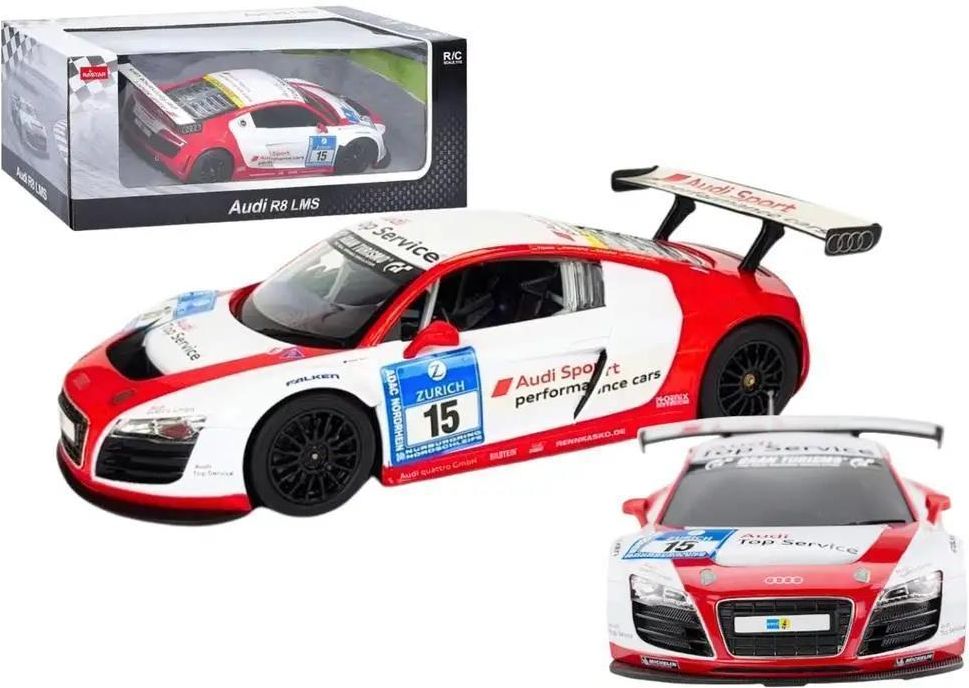 Auto R/C 1:24 Zdalnie Sterowane Sportowe AUDI R8 LMS Białe Przeżyj ekscytację jazdy legendarnym sportowym AUDI R8 LMS dzięki naszemu zdalnie sterowanemu modelowi! Oferujemy Ci możliwość wcielenia się w kierowcę jednego z najbardziej ikonicznych samochodów sportowych na świecie. Nasz model Audi R8 to nie tylko zabawka, ale również prawdziwa gratka dla miłośników motoryzacji i kolekcjonerów. Model odwzorowuje każdy detal prawdziwego Audi R8 w limitowanej wersji LMS, od agresywnej sylwetki po precyzyjnie wykonane wnętrze. Dzięki starannemu wykonaniu i dbałości o szczegóły, możesz poczuć się jak właściciel oryginału. Wykonany z trwałych materiałów, model zapewnia długą żywotność i odporność na uszkodzenia, a precyzyjne malowanie i realistyczne elementy podkreślają sportowy charakter tego pojazdu. Model posiada otwierane drzwi, dzięki czemu można zajrzeć do jego pięknie odwzorowanego wnętrza. Auto zasilane jest na akumulatory 5x 1.5V AA, które nie są elementem zestawu. Pilot zasilany jest na baterie 2x 1.5V AA, które nie są elementem zestawu. Wymiary auta 35 cm x 10 cm x 9 cm Wymiary opakowania 39 cm x 12 cm x 10 cm Posiada certyfikat CE, ponadto jest zgodny z normą EN71. Przeznaczony dla dzieci powyżej 6 roku życia. Informacje o produkcie Ostrzeżenie! Nieodpowiednie dla dzieci w wieku poniżej 6 lat Płeć Chłopcy Wiek 6+ Długość towaru w centymetrach 39 Wysokość towaru w centymetrach 10 Szerokość towaru w centymetrach 12 Waga gabarytowa w gramach 780