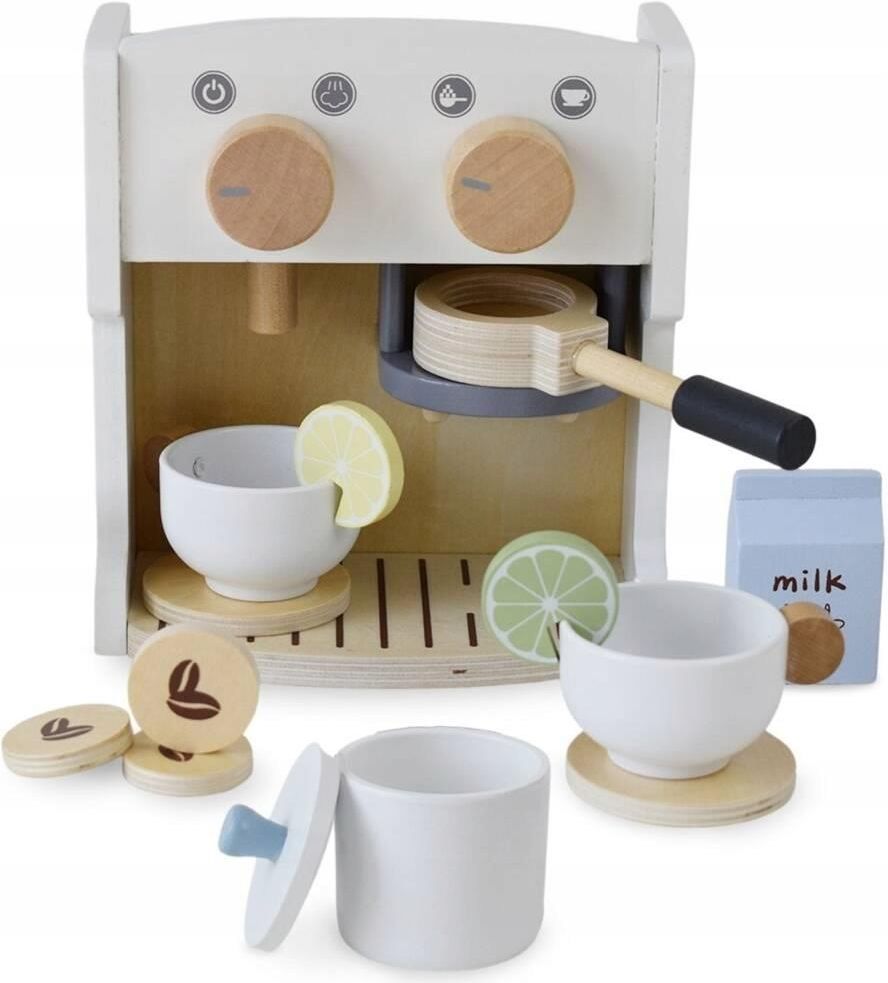 Dane techniczne Numer katalogowy: MAM135 COFFEE MAKER Materiał: drewno sosnowe, sklejka, MDF Waga: 0,8 kg Wymiary opakowania: 17,8 cm x 10,2 cm x 19,8 cm Wymiary kolby: 14 cm x 5,1 cm Wymiary ekspresu: 16,2 cm x 9,5 cm x 17,5 cm Zestaw zawiera: Drewniany ekspres do kawy z klikającymi pokrętłami, 2 filiżanki ze spodkami, cukierniczkę, kolbę do kawy, mleko, 2 plasterki cytryny, 3 drewniane krążki z ziarnami kawy, nasz firmowy kalendarzyk Długość towaru w centymetrach: 20 Wysokość towaru w centymetrach: 11 Szerokość towaru w centymetrach: 18 Waga gabarytowa w gramach: 660 Drewniany ekspres do kawy i herbaty z akcesoriami - kawiarnia Kto ma ochotę na aromatyczną kawę z ekspresu? A może na herbatę z cytryną? Odgrywanie roli baristy to dla dziecka doskonały przepis na kreatywną rozrywkę! Zabawę w przygotowywanie kawy czas zacząć! Drewniany ekspres z klikającym pokrętłem pozwoli dziecku wcielić się w rolę doświadczonego baristy i przyrządzić aromatyczny napój dla wszystkich członków rodziny, ulubionych lalek lub misiów. Do ekspresu dołączono liczne akcesoria, by jeszcze bardziej urozmaicić smykowi rozrywkę. Maluch może umieszczać krążki z ziarnami kawy w kolbie lub w filiżankach. Dla tych osób, które nie lubią kawy, przygotuje rozgrzewającą herbatę z cytryną. Główne cechy zabawka wykonana z wysokiej jakości drewna liczne akcesoria w zestawie klikające pokrętła ekologiczny charakter trwałe, solidne wykonanie staranne wykończenie brak ostrych krawędzi gładka, wyszlifowana powierzchnia, pokryta nietoksycznymi farbami nowoczesny design łagodne kolory zabawka odpowiednia dla dzieci powyżej 3. roku życia Jak działa ekspres? Drewniana zabawka, imitująca prawdziwe urządzenie pomoże dziecku znaleźć odpowiedź na to pytanie. Smyk pozna także rodzaje kawy i sposoby jej przyrządzania. Drewniany ekspres do kawy i herbaty rozwija kreatywność uczy samodzielności pozwala naśladować dorosłych to ćwiczenie dla umiejętności manualnych smyka Bezpieczeństwo Wykonana z dużą dbałością o detale zabawka nie posiada ostrych krawędzi. Spełnia wszelkie wymogi bezpieczeństwa, obowiązujące w UE, w tym dyrektywy CE i normy EN71. Jej powierzchnia została pokryta nietoksycznymi farbami.
