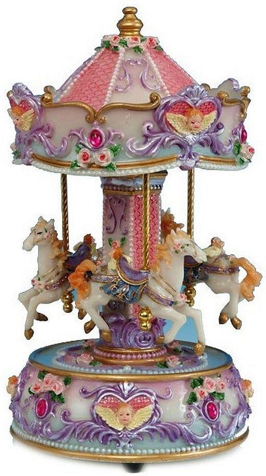 Karuzela "Rigoletto" z trzema końmi wykonana z dużą dbałością o szczegóły z syntetycznego, bardzo plastycznego tworzywa sztucznego zwanego popularnie "PolyStone", który nie zawiera jakichkolwiek niebezpiecznych pigmentów, dodatków, itp. Kolorystyka karuzeli utrzymana jest w odcieniach kolorów różowym i niebieskim. Karuzela oczywiście wyposażona jest w mechaniczną pozytywkę. Uruchomienie pozytywki powoduje jednocześnie wolne obracanie się kopuły/dachu pozytywki wraz z końmi(pod opisem znajduje się krótki film prezentujący karuzelę). Zastosowany materiał(PolyStone) ze względu na swoją plastyczność umożliwia wykonanie bardzo szczegółowych zdobień co widać w tej karuzeli, która ma mnóstwo detali/zdobień mających ją uatrakcyjnić wizualnie :-) Karuzele marki MMM z sukcesem sprzedają się na całym Świecie, m.in.: w luksusowym domu towarowym "Harrods" w Londynie i w również londyńskim, znanym sklepie zabawkowym "Hamleys"!!! Nic dziwnego... producentem przedstawionego produktu jest największy w Europie producent figurek-scenek i kul z pozytywką - niemiecki koncern MMM Gmbh. Spraw sobie lub spraw komuś powód do uśmiechu i kup tą piękną karuzelę-pozytywkę, to doskonały pomysł na miły oraz oryginalny upominek/prezent :-) Podstawowa specyfikacja: Rodzaj pozytywki: mechanicznaMelodia pozytywki: "Rigoletto", Giuseppe VerdiMateriał wykonania: PolyStoneWysokość = do około 23cm Średnica podstawy = około 14cmWaga = około 1,2kgNr kat.: 14143 PRODUKT NIE JEST U NAS W CIĄGŁEJ SPRZEDAŻY!!! SPROWADZANY NA INDYWIDUALNE ZAMÓWIENIE!!! - - - czas realizacji: 3-10 dni roboczych - - -