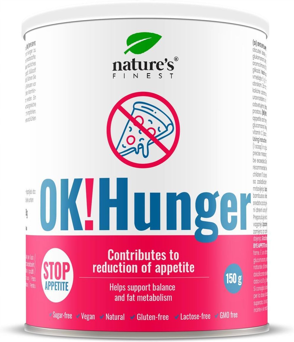 Masz ochotę przekąsić coś słodkiego, ale boisz się, że zepsuje to Twoją dietę? Lubisz podjadać między posiłkami, ale nie chcesz przekraczać dziennego limitu kalorii? OK! Hunger marki Nature's Finest to suplement diety, który Ci pomoże! Skład: Wielkość opakowania: 150 g Porcja jednorazowa: 5 g Ilość porcji w opakowaniu: 30 Składniki: Maltodekstryna, glukomannan, ekstrakt z kozieradki, stabilizator: celuloza w proszku, naturalny aromat cytrynowy (3%), witamina C (kwas askorbinowy), naturalny barwnik z buraka, substancja słodząca glikozydy stewiolowe. Sposób użycia: 30 minut przed każdym posiłkiem wymieszaj 1 miarkę (5 g) proszku w szklance wody. Wypij 1 szklankę OK!Hunger przed śniadaniem, obiadem i kolacją, a Twój apetyt znacznie się zmniejszy! Przeciwwskazania: Nadwrażliwość na którykolwiek ze składników preparatu. W okresie ciąży i karmienia piersią przed zastosowaniem należy skonsultować się z lekarzem lub farmaceutą. Przechowywanie: W miejscu niedostępnym dla małych dzieci. Przechowywać w suchym miejscu, unikać nadmiernego ciepła. Nie używać, jeśli uszczelka pod korkiem jest uszkodzona lub jej brakuje. Informacja: Produkt nie może być stosowany jako substytut (zamiennik) prawidłowo zróżnicowanej diety. Zrównoważony sposób żywienia i prawidłowy tryb życia jest ważny dla funkcjonowania organizmu człowieka. Nie należy przekraczać maksymalnej zalecanej porcji do spożycia w ciągu dnia.