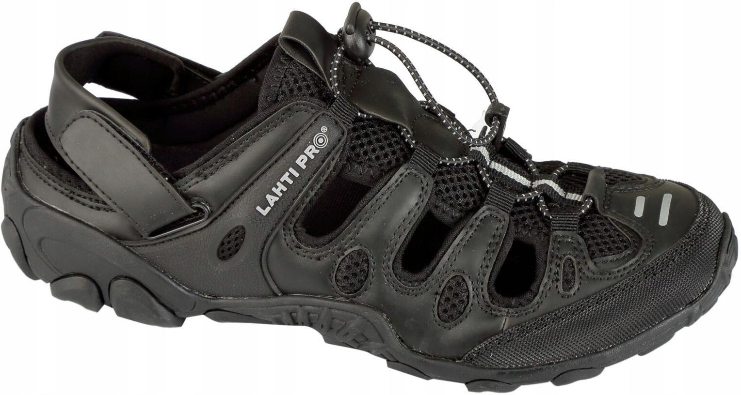 SANDAŁY PU/DZIANINA CZAR.-SZAR., "39", LAHTI Lahti Pro MATERIAŁ: Wierzch: PU/dzianina siatkowa, elastyczne sznurowadła regulowane zaciskiem. Podszewka: dzianina siatkowa. Wyściółka: wymienna (wkładki z elastyczną poduszką tłumiącą wstrząsy oraz podkładką łagodzącą nacisk stopy na podłoże). Podeszwa: gumowa o wysokiej elastyczności, głęboki protektor zapewnia wysoką stabilność obuwia
