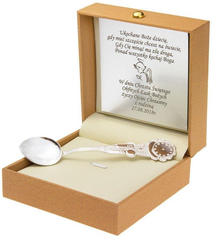 Łyżeczka Srebrna 925 z GRAWEREM Chrzest Urodziny Łyżeczka wykonana ze srebra pr. 925 Waga: ~11g Wymiary: 10,5x2,5cm Grawer z obu stron łyżeczki wliczony w cenę Dane do grawerowania: imię, data urodzenia, data chrztu, waga, wzrost, godzina urodzenia Grawerowana tabliczka z Twoją dedykacją Całość zapakowana w eleganckie skórzane pudełko prezentowe Grawerunek Chcesz sprawić bliskiej osobie wyjątkowy prezent? Dzięki personalizacji każdy zakupiony u nas produkt staje się niepowtarzalny i jedyny w swoim rodzaju. Dokładamy wszelkich starań aby wykonany grawerunek był najwyższej jakości i pozytywnie zaskoczył obdarowaną osobę. Długość tekstu w miarę możliwości technicznych Możliwość graweru dowolnego tekstu lub logo Grawer wykonany jest techniką laserową Gwarantujemy wieczystą trwałość wykonanego grawerunku Jak zamawiać Zakup produkt na aukcji Allegro Dodaj uwagi do zakupu podczas składania zamówienia wpisując treść graweru z wybraną czcionką i grafiką oraz krótkim opisem jak ma zostać wykonane zamówienie Jeżeli ma zostać wygrawerowany własny plik graficzny prześlij go mailowo Galeria Przykładowe Tabliczki Czcionki oraz Grafiki