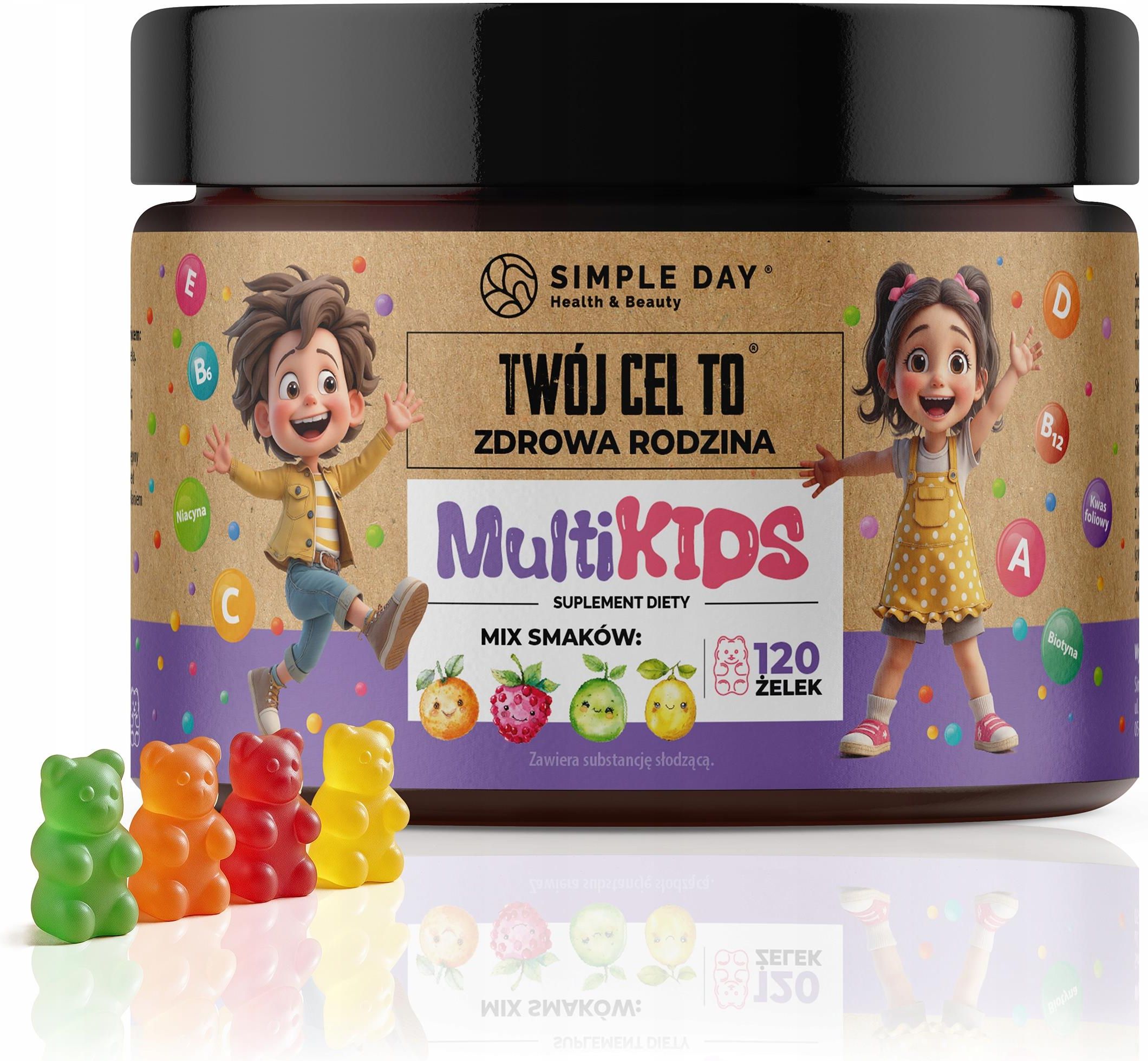 Żelki witaminy NA ODPORNOŚĆ dla dzieci BEZ CUKRU wit. C B6 B12 D misie MULTIKIDS - żelki witaminowe dla dzieci i dorosłych bez cukru | 120 sztuk Szukasz suplementu, który dziecko będzie przyjmować z przyjemnością? Zależy Ci na wsparciu odporności i rozwoju, ale bez walki o każdą tabletkę? MULTIKIDS ŻELKI to suplement diety, który może stać się codziennym, zdrowym nawykiem dla całej rodziny. To aż 9 ważnych witamin zamkniętych w owocowych żelkach - bez dodatku cukru, z naturalnymi aromatami i smakami, które dzieci pokochają. Dlaczego warto wybrać MULTIKIDS? To suplement diety w formie żelków, który wspiera odporność, rozwój układu nerwowego i zdrowie kości. Zawiera zestaw witamin: C, D, A, E, B6, B12, niacynę, kwas foliowy i biotynę - w porcjach dopasowanych do codziennego zapotrzebowania. MULTIKIDS to wygodna forma suplementacji - bez cukru, bez żelatyny i bez zbędnych dodatków. Dla kogo przeznaczony jest MULTIKIDS? Dla dzieci od 4. roku życia, młodzieży i dorosłych. To jeden produkt, który może być stosowany przez wszystkich członków rodziny - bez konieczności kupowania kilku osobnych suplementów. Idealny w okresie jesienno-zimowym, przy zwiększonym wysiłku fizycznym, intensywnej nauce lub w sytuacji, gdy dieta nie dostarcza wystarczającej ilości witamin. Jakie witaminy zawiera MULTIKIDS? Nazwa składnika, 2 żelki, %RWS Witamina C, 60 mg, 75% Niacyna, 16 mg, 100% Witamina E, 12 mg, 100% Witamina B6, 1,4 mg, 100% Witamina A, 400 µg, 50% Kwas foliowy, 200 µg, 100% Biotyna, 50 µg, 100% Witamina D, 10 µg, 200% Witamina B12, 2,5 µg, 100% *RWS – Referencyjne Wartości Spożycia, , W każdej dziennej porcji (2 żelki) znajdują się składniki, które wspierają wiele funkcji organizmu: Witamina C wspiera odporność i chroni komórki przed stresem oksydacyjnym Witamina D3 przyczynia się do utrzymania zdrowych kości i zębów Witamina A pomaga w utrzymaniu prawidłowego widzenia Witamina E pomaga w ochronie komórek przed wolnymi rodnikami Witaminy B6, B12 i niacyna wspierają układ nerwowy i redukcję zmęczenia Kwas foliowy wspiera prawidłowe funkcje psychologiczne i układ krwiotwórczy Biotyna pomaga w utrzymaniu zdrowej skóry i włosów Czy MULTIKIDS może zastąpić słodycze? Może być pyszną alternatywą dla codziennych przekąsek! MULTIKIDS to żelki bez dodatku cukru - ich słodycz pochodzi z ksylitolu i maltitolu. Dzieci traktują je jak przysmak, a Ty masz pewność, że dostarczasz im ważne składniki odżywcze bez niepotrzebnych kalorii. Jak dawkować MULTIKIDS? dzieci od 4 do 12 lat: 1 żelek dziennie dzieci powyżej 12 lat i dorośli: 2 żelki dziennie Opakowanie zawiera 120 żelków - to nawet 4 miesiące suplementacji dla jednej osoby. Jakie smaki znajdziesz w opakowaniu? Cztery naturalne i lubiane przez dzieci smaki: truskawkowy, pomarańczowy, cytrynowy i jabłkowy - w formie miękkich, kolorowych żelków. Często pytacie - odpowiadamy Czy można podawać dziecku codziennie? Tak, suplementacja zgodna z zaleceniami producenta może być stosowana codziennie jako uzupełnienie diety. Czy produkt zawiera cukier? Nie. MULTIKIDS jest bez dodatku cukru. Słodycz pochodzi z bezpiecznych substancji słodzących - maltitolu i ksylitolu. Od jakiego wieku można stosować? MULTIKIDS jest przeznaczony dla dzieci od 4. roku życia oraz osób dorosłych. Ostrzeżenia i informacje dodatkowe Nie należy przekraczać zalecanej porcji do spożycia w ciągu dnia. Suplement diety nie może być stosowany jako substytut zróżnicowanej diety i zdrowego trybu życia. Nie stosować w przypadku uczulenia na którykolwiek ze składników. Produkt należy przechowywać w temperaturze pokojowej, w suchym i chłodnym miejscu, niedostępnym dla małych dzieci. Nadmierne spożycie może powodować efekt przeczyszczający (ze względu na obecność maltitolu). Co zawiera opakowanie? 120 żelków o owocowych smakach (truskawka, cytryna, pomarańcza, jabłko) mix smaków w wygodnym, zamykanym opakowaniu suplement diety dla dzieci i dorosłych – wystarcza nawet na 4 miesiące Zadbaj o codzienne wsparcie odporności, rozwoju i energii w swojej rodzinie. MULTIKIDS to wygodna, nowoczesna forma suplementacji, która łączy zdrowie i smak w jednej porcji. Spróbuj raz - dzieci będą prosić o więcej.