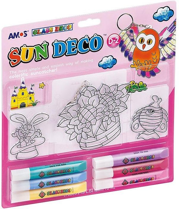 Farby witrażowe Amos Sun Deco 10.5ml x6 kolorów X20846 * farby witrażowe AMOS SUN DECO * wysokiej jakości farby witrażowe przeznaczone do samodzielnego wykonania witraży oraz dekoracji szkła, porcelany, luster, płytek ceramicznych i tworzyw sztucznych * wyraziste kolory * łatwa aplikacja farb * gotowy, wyschnięty wzór można (odkleić) przenosić z folii na inne powierzchnie * możliwe jest łączenie farb witrażowych z innymi technikami: klejem z brokatem, Ciasto Plasto * zgodne z wymaganiami Unii Europejskiej i ASTM D-4236 * kolory farb: zielony, niebieski, żółty, fioletowy, czerwony, różowy * w opakowaniu: 3 gotowe witraże - breloki do pomalowania, 6 pojemników 10,5 ml z farbą * jednostka sprzedaży 1 opakowanie * marka AMOS należy do firmy KW TRADE, która jest jedynym importerem tej marki w Polsce - Amos to produkty kreatywne, przybory szkolne, akcesoria plastyczne i masy plastyczne Ciasto Plasto, brokaty w kleju, brokaty sypkie, farby witrażowe i kredki do szkła dostępne dla każdej grupy wiekowej - są znane w Polsce od około 30 lat, ale zdążyły zdominować już światowy rynek artykułów biurowych - popularność przyborów szkolnych Amos'a spowodowała, iż jest on dostępny w większości sklepów papierniczych w Polsce - akcesoria plastyczne i kreatywne tej marki zyskują coraz większą popularności wśród dzieci przedszkolnych i szkolnych Parametry Symbol dostawcy: 170-1548