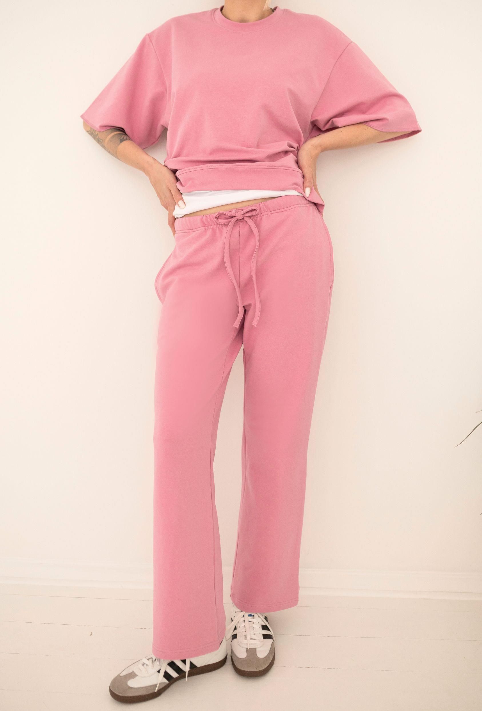 KOLOR: RÓŻOWY Bawełna 94%, elastan 6% Elastyczny jersey bawełniany. GRAMATURA: 300 G/M2 Luźne spodnie o swobodnym kroju, które doskonale sprawdzą się w codziennych stylizacjach. Miękka tkanina i elastyczna talia zapewnią wygodę przez cały dzień. Zaprojektowane i uszyte w Polsce. • proste, szerokie nogawki, • elastyczna talia ze sznurkiem do regulacji, • wygodne kieszenie, • staranie wykończone detale. Wymiary spodni (w centymetrach, mierzone na płasko): S: długość całkowita 95, szerokość w talii 36, szerokość w biodrach 46, M: długość całkowita 97, szerokość w talii 38, szerokość w biodrach 48, L: długość całkowita 100, szerokość w talii 40, szerokość w biodrach 50.