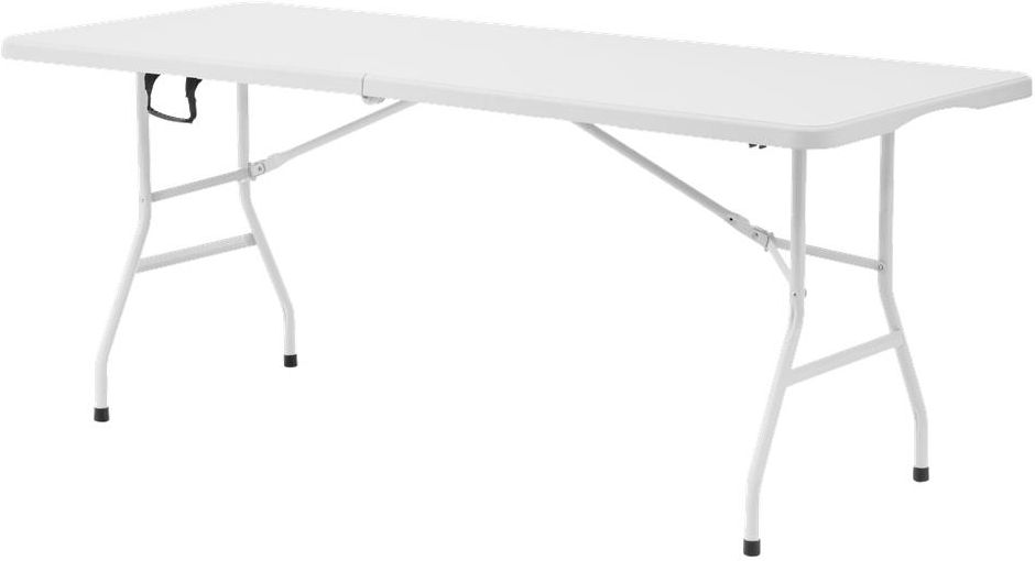 Składany stół z blatem wykonanym z jasnoszarego tworzywa HDPE i nogami ze stali malowanej proszkowo. W pozycji złożonej dostępny jest uchwyt do przenoszenia.