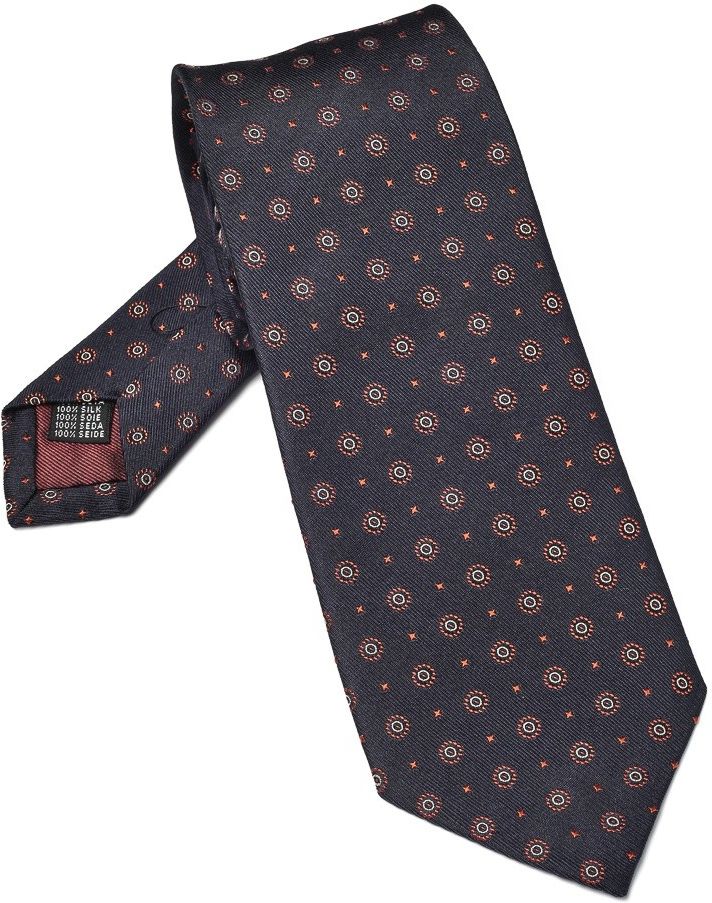 Elegancki granatowy krawat marki VAN THORN. Wykonany z jedwabiu, na bordowej podszewce. Krawat jest we wzór kółek z szarą obwódką i kremowym środkiem oraz w drobne, szare kropeczki. Jest elegancki i stonowany, będzie pasował do biznesowych stylizacji. Idealny do granatowego, czarnego czy szarego garnituru. Może być doskonałym prezentem dla eleganckiego mężczyzny.