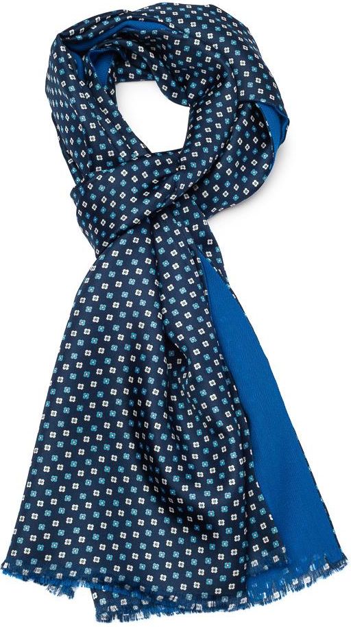 Stylowy szal dwustronny z jedwabiu i wełny. Szal ten jest posiada dwie różne powierzchnie. Z jednej strony szal jest z granatowego jedwabiu w białe i błękitne kwiaty, a z drugiej strony jest gładka niebieska wełna. Szal jest z jednej strony bardzo ciepły i miękki a z drugiej elegancki i stylowy. Sprawdzi się w połączeniu z eleganckim płaszczem. Wymiary: 160 cm długości i 32 cm szerokości Skład: Jedwab 100% i Wełna 100%