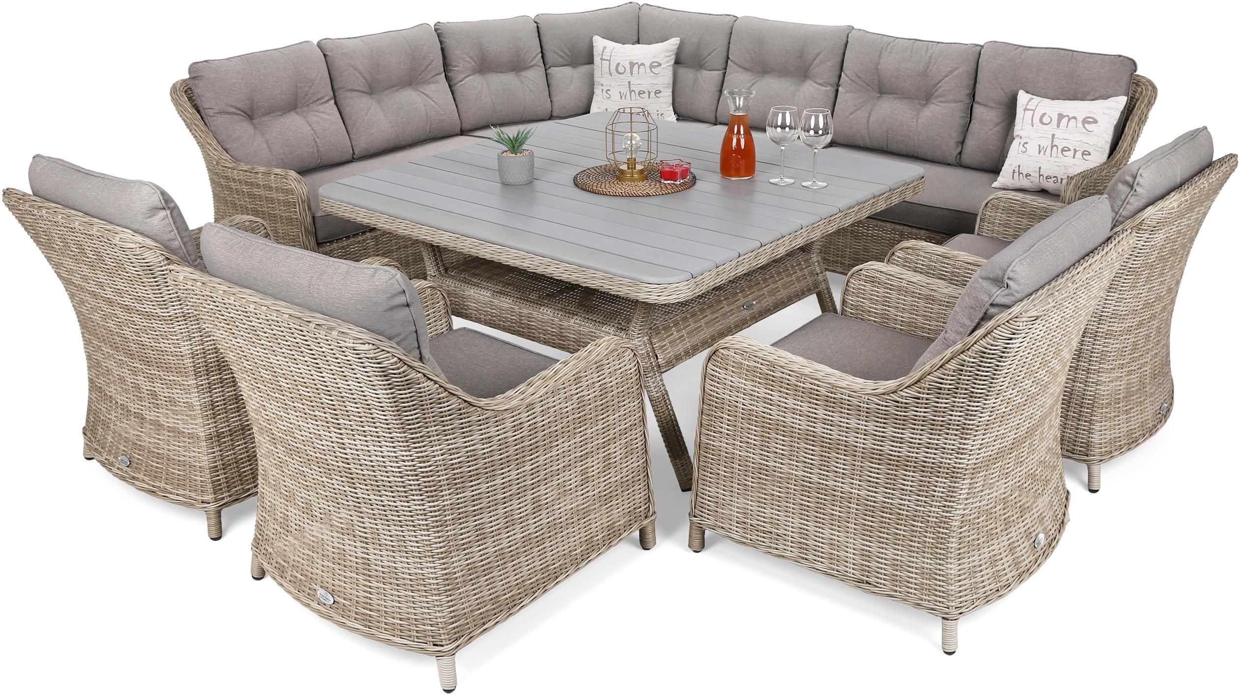 Liczba osób 11 Materiał konstrukcyjny aluminium malowane proszkowo Pokrycie technorattan Kolor pokrycie beżowe, poduchy beżowy melanż Wymiary stołu (szer. x dł. x wys.) lub (średn. x wys.) 138 cm x 138 cm x 70 cm Blat stołu / stolika deski kompozytowe WPC Wymiary fotela (szer. x gł. x wys.) 71 cm x 71 cm x 85 Wymiary segmentów (szer. x gł. x wys.) segment lewy i prawy 126 cm x 71 cm x 85 cm, środkowy 57 cm x 71 cm x 85 cm, narożny 100 cm x 100 cm x 85 cm Szerokość wewn. siedziska segment lewy i prawy 120 cm, środkowy 58 cm, fotel 60 cm Głębokość wewn. siedziska wszystkie segmenty i fotel 60 cm Wysokość siedziska wszystkie segmenty i fotel 33 cm Szerokość wewn. oparcia segment lewy i prawy 120 cm, środkowy 58 cm, fotel 60 cm Wysokość wewn. oparcia wszystkie segmenty i fotel 53 cm Poduchy siedzisko segmentu lewego i prawego 120 cm x 63 cm x 10 cm (2 szt.), środkowego 57,5 cm x 63 cm x 10 cm (1 szt.), narożnego (1 szt.), fotela 60 cm x 63 cm x 10 cm (4 szt.), oparcie 60 cm x 50 cm x 12 cm (10 szt.), oparcie narożne 53 cm x 43 cm x 52 cm x 50 cm x 12 cm (2 szt.) Dodatkowe informacje stół wymaga montażu (blat w całości); produkt wysyłany przesyłką paletową; W komplecie 4 segmenty narożnika, 4 fotele stół, poduchy wg specyfikacji, zestaw montażowy