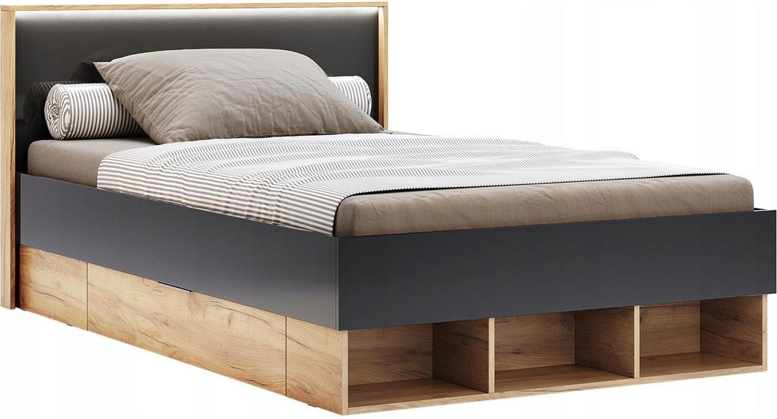 Łóżko młodzieżowe Lana 120x200 to nowoczesny mebel do sypialni, który łączy praktyczność z estetyką. Wyróżnia się tapicerowanym szarym wezgłowiem, funkcjonalnymi szufladami oraz efektownym oświetleniem LED. Wykonane z płyty wiórowej i tkaniny o wykończeniu półmatowym w kolorze naturalnego dębu, doskonale wpisuje się w nowoczesny styl aranżacji pokoju młodzieżowego lub sypialni dla nastolatka. Nowoczesny design, który inspiruje do zmian Łóżko Lana to propozycja dla osób ceniących prostotę i modne rozwiązania. Szlachetne połączenie odcienia dębu z szarym tkaninowym zagłówkiem sprawia, że mebel nadaje wnętrzu lekkości i przytulności. Oświetlenie LED w zagłówku nie tylko tworzy wyjątkowy klimat, ale też ułatwia wieczorne czytanie lub relaks, eliminując potrzebę dodatkowej lampki nocnej. Przestrzeń pod kontrolą – szuflady i pojemnik na pościel Łóżko młodzieżowe z szufladami to rozwiązanie idealne do mniejszych pokojów, gdzie każdy centymetr ma znaczenie. Dwie pojemne szuflady i praktyczny pojemnik na pościel pomagają utrzymać porządek bez konieczności rezygnowania z miejsca na ulubione akcesoria czy zapasową kołdrę. Dzięki powierzchni spania 120x200 cm, łóżko sprawdzi się zarówno jako łóżko jednoosobowe, jak i wygodne miejsce dla młodzieży czy gości. Tapicerowane wezgłowie w kolorze szarym – komfortowe oparcie podczas czytania lub nauki Wbudowane oświetlenie LED – przyjemna, nastrojowa atmosfera każdego wieczoru Szuflady i pojemnik na pościel – więcej miejsca do przechowywania i łatwe utrzymanie ładu Nowoczesne wzornictwo – harmonizuje z modnym stylem sypialni młodzieżowej Wytrzymała konstrukcja z płyty wiórowej – stabilność i długotrwałe użytkowanie Idealne łóżko młodzieżowe do nowoczesnej sypialni Model Lana 120x200 to rozwiązanie stworzone z myślą o komforcie nastolatków i młodych dorosłych. Świetnie sprawdzi się jako łóżko młodzieżowe do pokoju młodzieżowego, ale także do sypialni gościnnej czy niedużego mieszkania. Przemyślana konstrukcja oraz modne wzornictwo czynią je nie tylko funkcjonalnym, ale i stylowym wyborem na lata. Jeśli szukasz łóżka nowoczesnego, które pozwoli na maksymalnie efektywne wykorzystanie przestrzeni, Lana będzie strzałem w dziesiątkę.
