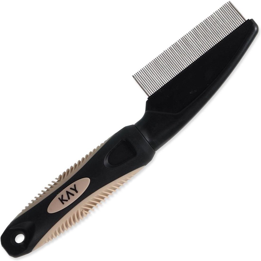 Przeznaczenie grzebienia KAY dla psa do wyczesywania pchełGrzebień dla psów, przeznaczony do wyczesywania pcheł oraz do pielęgnacji wszystkich rodzajów sierści. Dzięki bardzo gęstym mocnym i wytrzymałym zębom, grzebień skutecznie usuwa pasożyty z psiej sierści. Zaokrąglone na końcach zęby chronią skórę zwierzęcia przed podrażnieniem. Cechy grzebienia KAY: długość: 21cm Materiał użyty do produkcji: tworzywo sztuczne/stal nierdzewna Kolor: czarny/szary Charakterystyka grzebienia KAY dla psa do wyczesywania pchełGrzebień zaprojektowany w nowoczesnym stylu, w modnym, stonowanym kolorze Akcesorium pielęgnacyjne o harmonijnym i dynamicznym kształcie, które z pewnością przypadną do gustu użytkownikom. Grzebień KAY posiada uchwyt, który zapewnia większą wygodę użytkowania i idealnie leży w dłoni, dzięki ergonomicznemu kształtowi. Zalety grzebienia KAY dla psa do wyczesywania pcheł: Wysoka jakość wykonania – tworzywo ABS, szczególnie odporne na upływ czasu Wygodny uchwyt, zwiększający wygodę użytkowania, pokryty powłoką z gumy termoplastycznej Miękkie i przyjemne w dotyku wykończenie Metalowe elementy wykonane ze stali nierdzewnej Dane producenta:Plaček Pet Products s.r.o.Revoluční 1381/III290 01 PoděbradyCzech RepublicEmail: info@placek.cz