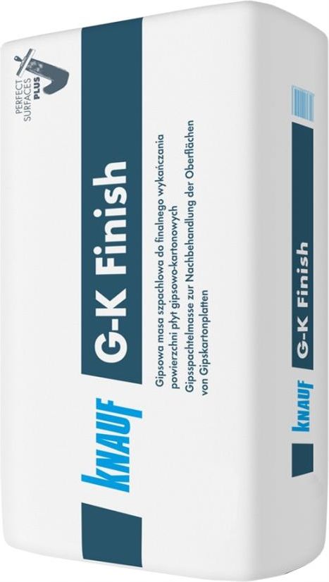Knauf Gładź gipsowa G-K Finish 25 kg Gładź gipsowa Knauf G-K Finish stosowana jest do ręcznego, finalnego wykańczania powierzchni wszystkich rodzajów płyt gipsowo-kartonowych w standardzie Q3 i Q4. Może być stosowana na powierzchniach mineralnych, takich jak tynki gipsowe, tynki cementowo-wapienne oraz żywiczne po ich wcześniejszym przygotowaniu za pomocą odpowiedniego środka gruntującego. Może być nakładana ręcznie zachowując maksymalną grubość pojedynczej warstwy do 3 mm. Cechy charakterystyczne Sypka, gotowa do rozrobienia zaprawa. Produkt wiążący, czas roboczy ok. 60 min. Stanowi system z produktem Knauf G-K Start. Kolor po wyschnięciu zbliżony do koloru Knauf G-K Start. Łatwe mieszanie ręczne i mechaniczne. Łatwe uzyskanie jednolitej masy. Możliwość regulowania konsystencji poprzez dodawanie proszku lub wody. Bardzo dobre właściwości aplikacyjne. Bardzo dobra przyczepność do podłoża. Łatwe szlifowanie wyschniętej powierzchni. Pozwala na uzyskanie bardzo gładkich powierzchni ścian i sufitów idealnych pod malowanie lub inne prace dekoracyjne. Gładkie przejście pomiędzy powierzchnią płyty, a gładzią po szlifowaniu etapu Q3. Parametry Waga: 25kg Kod produktu: 585201