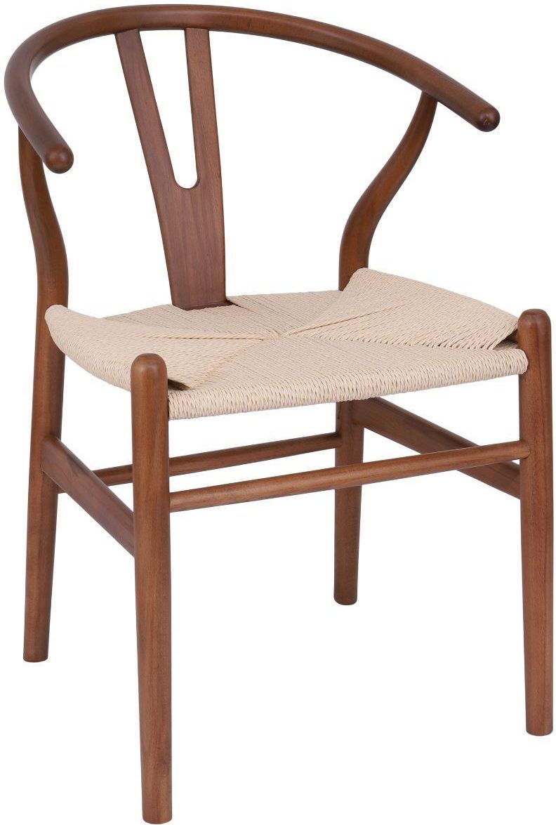 Krzesło drewniane Vero walnut marki Avida Design, wykonane z solidnego drewna bukowego w orzechowym kolorze w stylu retro. Całość projektu nawiązuje do popularnego krzesła Wishbone wytwarzane nieprzerwanie od 1950 roku przez firmę Carl Hansen & Søn, co dodaje mu unikalności i sprawia, że staje się ono idealnym wyborem dla tych, którzy cenią sobie zarówno nowoczesny design, jak i tradycyjną solidność wykonania. To jedno z najbardziej rozpoznawalnych dzieł mistrza projektowania, Hansa J. Wegnera.Dodatkowo, drewno bukowe jest znane ze swojej wytrzymałości, co gwarantuje trwałość krzesła przez wiele lat użytkowania.Siedzisko z naturalnych włókien - plecionka w kolorze naturalnym to nie tylko estetyczny element, ale również ekologiczny wybór, który wspiera zrównoważoną produkcję. Dzięki temu krzesło Vero nie tylko cieszy oko swoim nowoczesnym designem, ale także wpisuje się w idee przyjazne środowisku.Jego wyjątkowość wynika z ręcznego wykonania, co sprawia, że każdy egzemplarz może nieco się różnić, a jednocześnie dodając mu wartości jako unikatowego dzieła.Warto podkreślić, że drewno używane do produkcji tego krzesła jest specjalnie obrabiane wyłącznie z naturalnego drewna, łączonego bądź w całości, zachowując wszystkie jego naturalne cechy takie jak: nierówności, zagłębienia czy sęki. Nóżki krzesła zabezpieczone są stopkami, aby zapobiec rysowaniu się podłogi. Wymiary: wysokość 75 cm., szerokość 53,5 cm., głębokość 42,5 cm., wysokość od ziemi do siedziska 45 cm., wysokość od ziemi do końca nóżki 48 cm.*Wymiar nominalny w zależności od konfiguracji produktu może się nieznacznie różnić. Tolerancja wymiarów pomiędzy produktami z tej samej konfiguracji wynosi +/- 20mm. Model objęty jest 2-letnią gwarancją.Produkt dostarczymy do Państwa BEZPŁATNIE pod wskazany adres na terenie całego kraju.Co WAŻNE: zgodnie z prawem i naszym regulaminem mają Państwo pełne prawo do zwrotu nieużywanych towarów, jeśli nie spełnią one Państwa oczekiwań.
