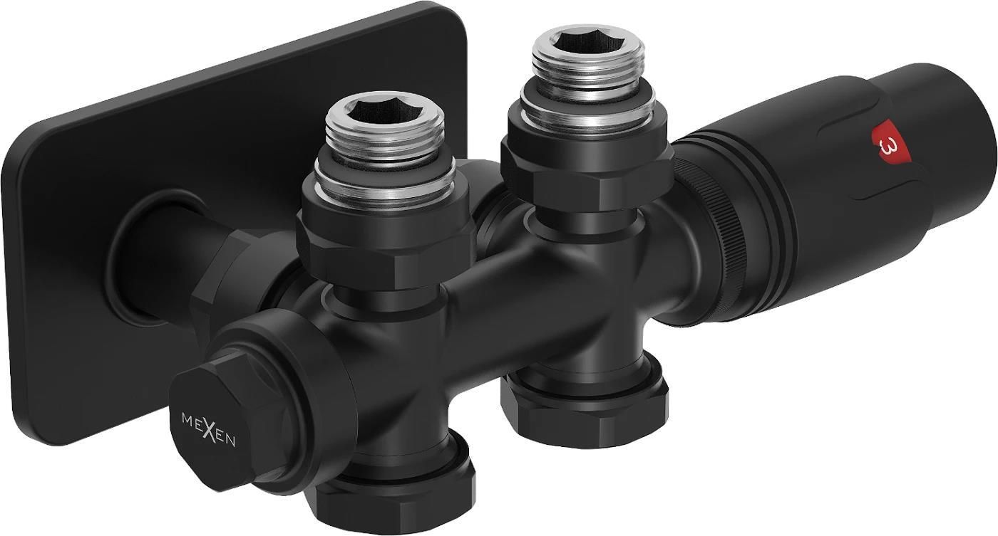Mexen G00 zestaw termostatyczny kątowy/prosty z maskownicą S, Duplex, DN50, czarny Producent: Mexen Seria: G00 Kod produktu: W908-900-910-70 Dane techniczne: Materiał zaworu: Mosiądz Kolor zaworu: Czarny Średnica przyłącza zaworu: G 1/2" Temperatura pracy: max 120 °C Maksymalne ciśnienie robocze: …