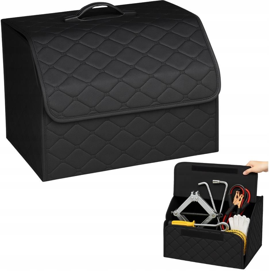 Torba do Bagażnika Samochodowego TSB-02 – Sztywny Organizer do Auta 39x31x29 cm Organizer do bagażnika samochodu TSB-02 o wymiarach 39x31x29 cm to idealne rozwiązanie dla kierowców, którzy cenią porządek, funkcjonalność i elegancki wygląd swojego auta. Dzięki większej pojemności z łatwością pomieści wszystkie niezbędne akcesoria – od narzędzi po produkty spożywcze. Stylowy czarny kolor i solidne wykonanie sprawiają, że organizer doskonale pasuje do każdego wnętrza samochodu, zapewniając nie tylko wygodę, ale i estetykę. Wykonany z wysokiej jakości eko-skóry, organizer jest trwały, odporny na zabrudzenia i wilgoć, a jednocześnie bardzo łatwy w czyszczeniu. Sztywna konstrukcja utrzymuje formę nawet przy pełnym załadunku, chroniąc zawartość przed przemieszczaniem się w trakcie jazdy. Pokrywka z mocnym zapięciem zabezpiecza wnętrze przed kurzem, a praktyczna rączka ułatwia przenoszenie torby z samochodu do domu lub garażu. Organizer samochodowy do bagażnika – większa pojemność i maksymalna wygoda Najważniejsze zalety Większa pojemność – większy rozmiar pozwala zmieścić jeszcze więcej akcesoriów i produktów. Trwały materiał – wykonany z odpornej na wilgoć i zabrudzenia eko-skóry. Pokrywka z zapięciem – skutecznie chroni zawartość przed kurzem i przypadkowym wypadnięciem. Uniwersalne zastosowanie – idealny do narzędzi, kosmetyków samochodowych, kabli, zakupów lub napojów. Składana konstrukcja – gdy nie jest używany, można go łatwo złożyć i schować. Elegancki design – czarny kolor i nowoczesne wykończenie pasują do każdego wnętrza auta. Łatwe czyszczenie – wystarczy przetrzeć wilgotną ściereczką, by przywrócić świeżość. Torba do bagażnika – idealny organizer do samochodu 39x31x29 cm Organizer TSB-01 to niezastąpiony pomocnik w każdej sytuacji – w podróży, w pracy czy w codziennym użytkowaniu. Dzięki większej pojemności pomieści wszystkie niezbędne rzeczy i pomoże zachować idealny porządek w bagażniku. Zastosowanie W codziennych przejazdach po mieście – do przechowywania dokumentów, zakupów, drobiazgów. W podróżach – idealny do transportu żywności, napojów czy kosmetyków. Dla rodzin z dziećmi – zmieści zabawki, akcesoria dziecięce, kocyki i ubrania. Dla kierowców zawodowych i hobbystów motoryzacji – na narzędzia, oleje, kable i środki czystości. W weekendowych wyjazdach – idealny do bagażu podręcznego i akcesoriów turystycznych. Organizer do bagażnika samochodu 39x31x29 cm TSB-02 to połączenie praktyczności, estetyki i trwałości. Większy rozmiar zapewnia jeszcze więcej przestrzeni do przechowywania, a elegancki design sprawia, że doskonale pasuje do każdego auta. To nie tylko funkcjonalny dodatek, ale również gwarancja porządku i komfortu w każdej podróży.