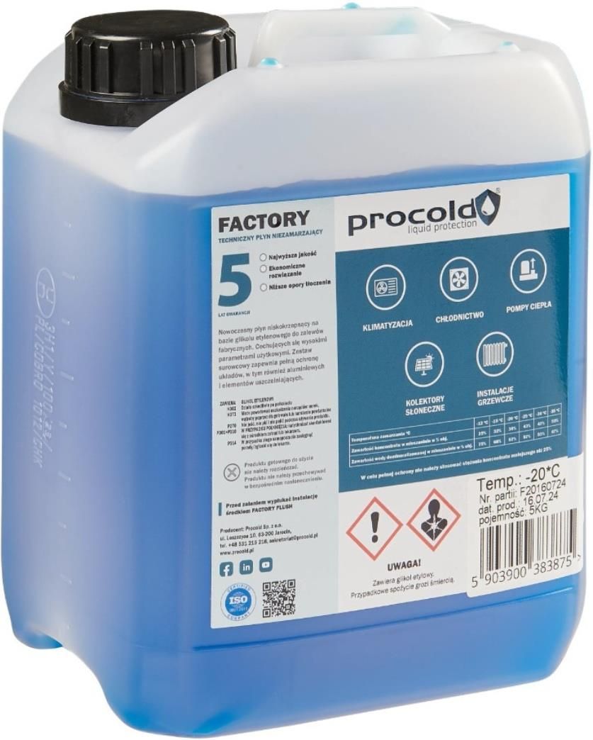 Płyn etylenowy Procold Factory -20°C 5 kg Środek na bazie glikolu etylenowego do instalacji grzewczych i chłodniczych Procold Factory -20°C to wysokiej jakości płyn niezamarzający na bazie glikolu etylenowego, przeznaczony do stosowania w zamkniętych układach grzewczych, chłodniczych oraz pomp ciepła. Skutecznie chroni instalację przed zamarzaniem do temperatury -20°C, a jednocześnie zabezpiecza ją przed korozją, osadzaniem kamienia oraz pienieniem. Produkt zawiera pakiet inhibitorów korozji i dodatków stabilizujących, co sprawia, że jest bezpieczny dla metali, aluminium i tworzyw sztucznych. Dzięki niskiej lepkości zapewnia sprawną cyrkulację w systemach, a jego długa trwałość ogranicza potrzebę częstych wymian. Dane techniczne: Producent: Procold Nazwa handlowa: Factory Rodzaj: płyn na bazie glikolu etylenowego Pojemność: 5 kg Temperatura krystalizacji: -20°C Zastosowanie: instalacje C.O., chłodzenie, pompy ciepła Zabezpieczenia: antykorozyjne, antypienne, przeciwosadowe Kolor płynu: czerwony (lub zielony – zależnie od partii produkcyjnej) Najważniejsze właściwości: Chroni instalację przed zamarzaniem do -20°C Zabezpiecza przed korozją, kamieniem i tworzeniem się osadów Kompatybilny z typowymi materiałami instalacyjnymi (miedź, stal, aluminium, PEX) Nadaje się do stosowania w systemach grzewczych i chłodniczych Wydłużona trwałość – nawet do kilku sezonów bez wymiany Procold Factory -20°C 5 kg to niezawodny i ekonomiczny wybór dla każdego, kto chce skutecznie zabezpieczyć swoją instalację grzewczą lub chłodniczą przez cały sezon.