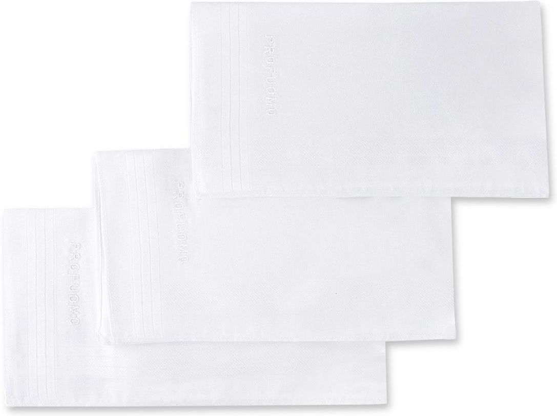 Zestaw trzech eleganckich białych chusteczek bawełnianych. Są one zapakowane w eleganckie pudełko i nadają się na prezent. Chusteczki mają delikatne przeszycia i wyhaftowane logo Profuomo.