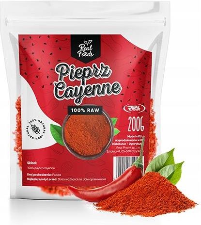 Real Foods Naturalny Pieprz Cayenne drobno mielony 200g Pieprz cayenne otrzymywany jest z owoców papryki krzewiastej. Jest to najostrzejsza odmiana papryki. W ostatnim czasie przyprawa ta znacznie zyskuje w naszym kraju na popularności nie tylko ze względu na swoje szerokie zastosowanie w kuchni, ale również ze względu na swoje właściwości prozdrowotne i odchudzające. Mielony pieprz cayenne wyróżnia się intensywnym zapachem i wyjątkowym smakiem. Dodana do potraw skutecznie rozgrzewa nasz organizm, a także zaostrza apetyt. Potęguje doznania smakowe wielu potraw, głównie tych mięsnych. Produkt pakowany w opakowanie typu doypack ze struną - dzięki temu możemy zamykać i otwierać przy zachowaniu świeżości produktu! W naszej szerokiej ofercie znajdziesz także pozostałe produkty marki Real Foods. Sprawdź nasz cały asortyment! Czekają na Ciebie różnego rodzaju witaminy, minerały, grzyby witalne, ekstrakty roślinne, adaptogeny, produkty poprawiające pracę mózgu oraz preparaty polepszające wytrzymałość i regenerację w sporcie. Skład: 100% Pieprz Cayenne Opakowanie: 200 g